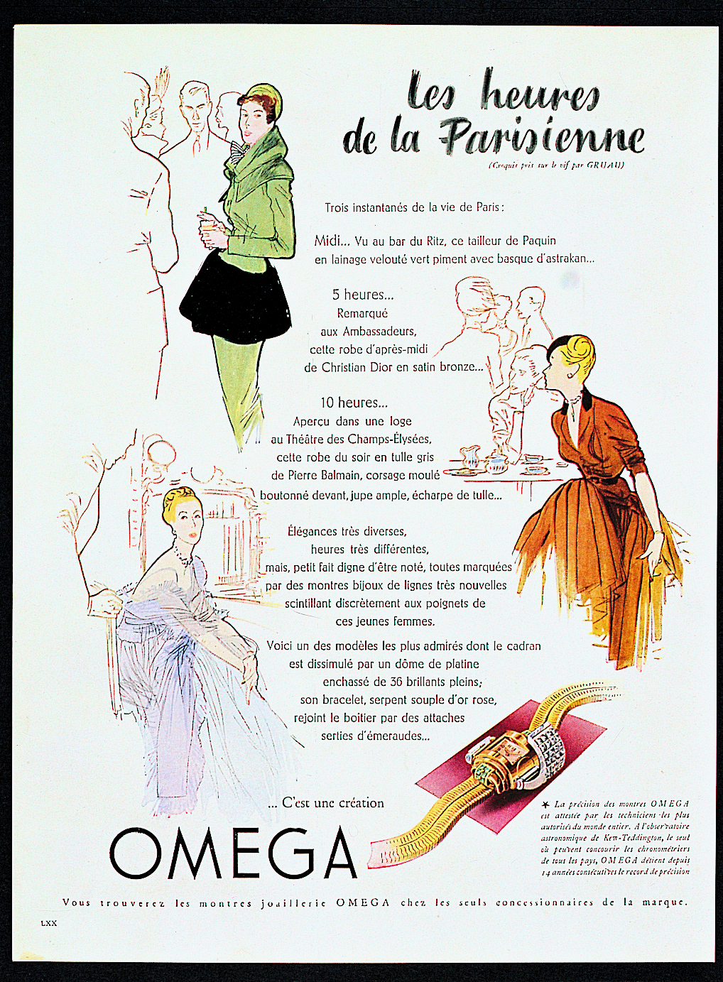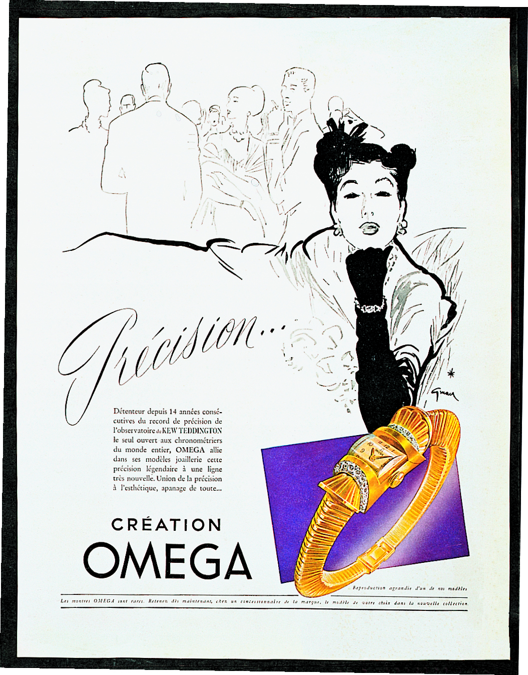 ความผูกพันระหว่าง ‘โอเมก้า’ กับ ‘ผู้หญิง’ ยังได้รับการถ่ายทอดผ่านผลงานโฆษณานาฬิกาชิ้นแล้วชิ้นเล่าที่สะท้อนบทบาทของผู้หญิงในหลากหลายแง่มุม ทั้งแฟชั่น การใช้ชีวิต หน้าที่การงาน ความรักเลยไปถึงครอบครัว แต่ผลงานที่เป็นที่จดจำมากที่สุดหนีไม่พ้น โฆษณานาฬิกาโอเมก้าที่ผสานสร้อยข้อมือทูโบกาส (Tubogas) ในปี 1946 ซึ่งวาดโดยศิลปินชื่อดังอย่าง René Gruau เนื่องมาจากลายเส้นโดดเด่นและภาพผู้หญิงสื่ออันถึงความมั่นใจ เฉลียวฉลาด โดดเด่น ทันสมัย มีเสน่ห์ และเป็นที่ยอมรับในวงสังคม ไม่ต่างอะไรจากบุคลิกของบรรดาแบรนด์ แอมบาสเดอร์ของโอเมก้าในปัจจุบัน ทั้งซุปเปอร์โมเดล ซินดี้ ครอว์ฟอร์ด, นักแสดงดังระดับโลก นิโคล คิดแมน, ลูกสาวคนสวยของซินดี้อย่าง ไคอา เกอร์เบอร์ หรือแม้แต่ผู้หญิงที่สวมใส่นาฬิกาโอเมก้าก็เช่นกัน