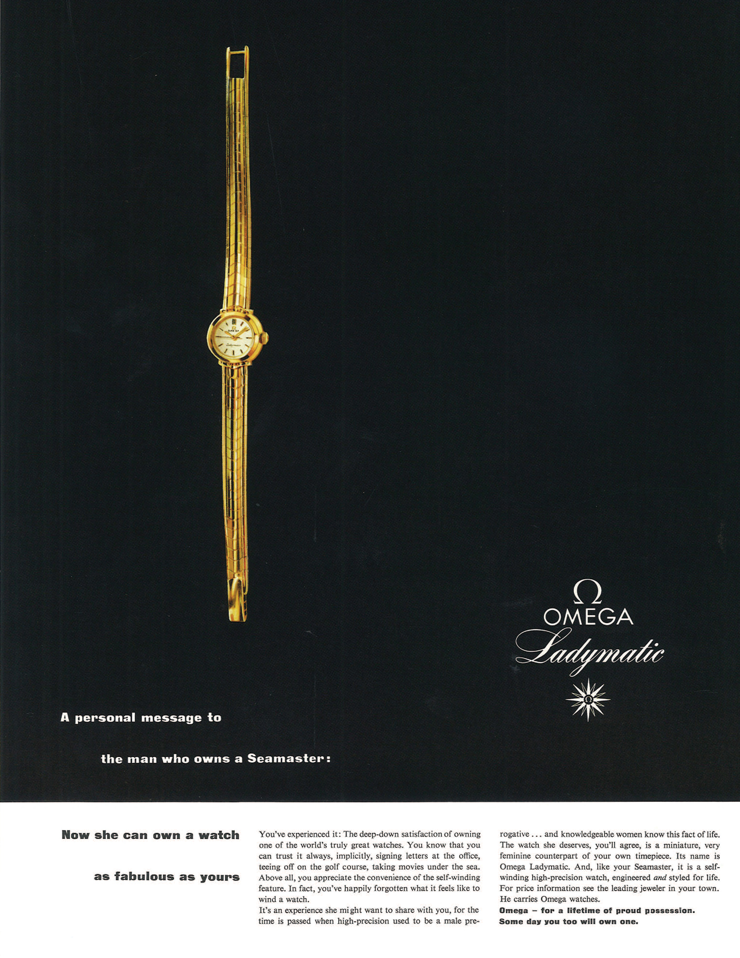 ความผูกพันระหว่าง ‘โอเมก้า’ กับ ‘ผู้หญิง’ ยังได้รับการถ่ายทอดผ่านผลงานโฆษณานาฬิกาชิ้นแล้วชิ้นเล่าที่สะท้อนบทบาทของผู้หญิงในหลากหลายแง่มุม ทั้งแฟชั่น การใช้ชีวิต หน้าที่การงาน ความรักเลยไปถึงครอบครัว แต่ผลงานที่เป็นที่จดจำมากที่สุดหนีไม่พ้น โฆษณานาฬิกาโอเมก้าที่ผสานสร้อยข้อมือทูโบกาส (Tubogas) ในปี 1946 ซึ่งวาดโดยศิลปินชื่อดังอย่าง René Gruau เนื่องมาจากลายเส้นโดดเด่นและภาพผู้หญิงสื่ออันถึงความมั่นใจ เฉลียวฉลาด โดดเด่น ทันสมัย มีเสน่ห์ และเป็นที่ยอมรับในวงสังคม ไม่ต่างอะไรจากบุคลิกของบรรดาแบรนด์ แอมบาสเดอร์ของโอเมก้าในปัจจุบัน ทั้งซุปเปอร์โมเดล ซินดี้ ครอว์ฟอร์ด, นักแสดงดังระดับโลก นิโคล คิดแมน, ลูกสาวคนสวยของซินดี้อย่าง ไคอา เกอร์เบอร์ หรือแม้แต่ผู้หญิงที่สวมใส่นาฬิกาโอเมก้าก็เช่นกัน