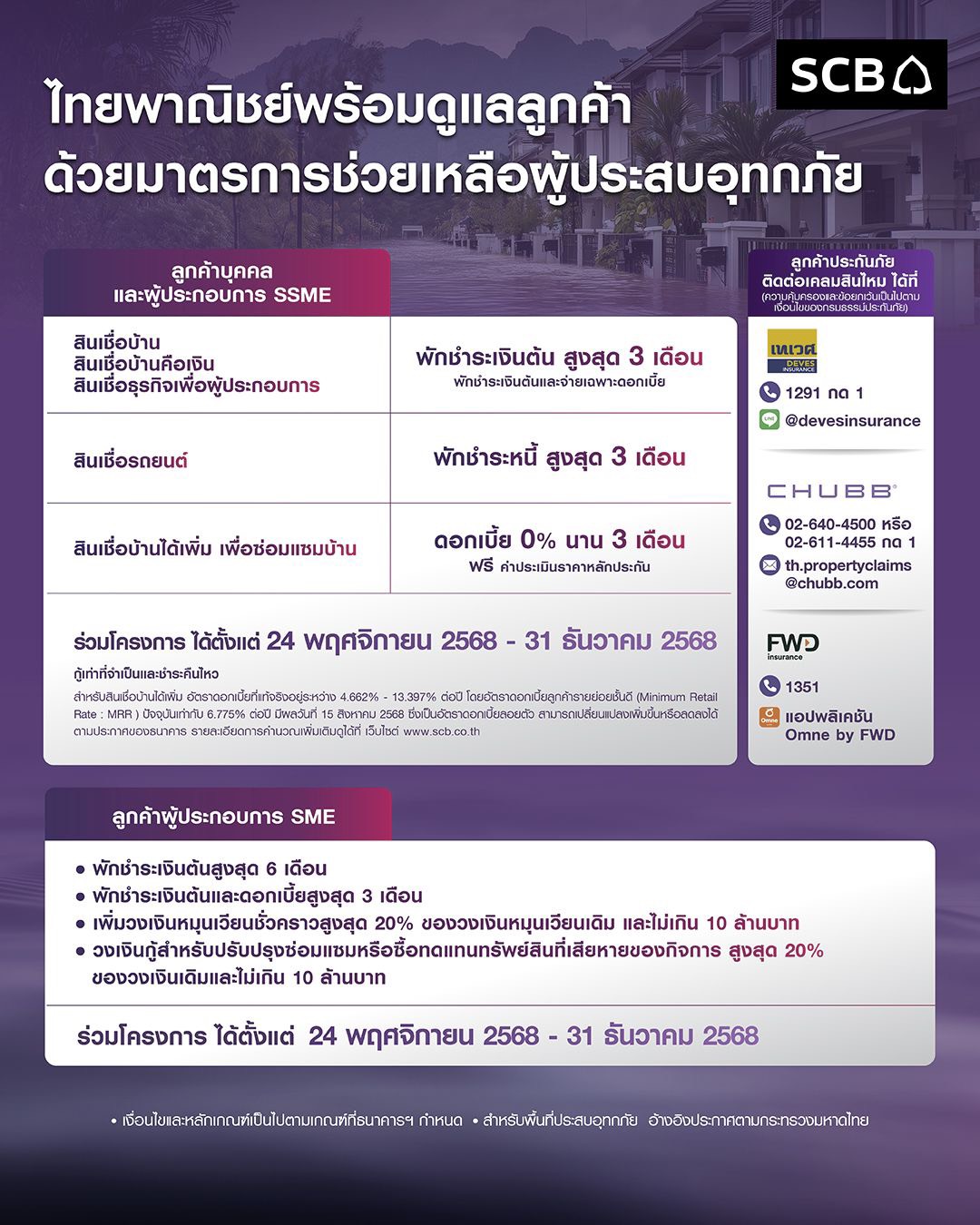 ลูกค้าผู้ประกอบการ SME สามารถติดต่อขอเข้าร่วมโครงการได้ที่เจ้าหน้าที่ธุรกิจสัมพันธ์ และ SCB Business Call Center โทร 02-722-2222 ได้ตั้งแต่วันที่ 24 พฤศจิกายน 2568  – 31 ธันวาคม 2568