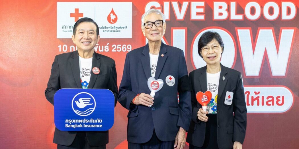 บริษัท กรุงเทพประกันภัย จำกัด (มหาชน) โดยนายธีรยุทธ กิจวรพัฒน์ (ซ้ายสุด) ผู้อำนวยการ ธุรกิจสาขา เป็นตัวแทนมอบเงินจำนวน 1,000,000 บาท ให้แก่สภากาชาดไทย โดยมีนายเตช บุนนาค (กลาง) เลขาธิการสภากาชาดไทย และรองศาสตราจารย์ แพทย์หญิงดุจใจ ชัยวานิชศิริ (ขวาสุด) ผู้อำนวยการศูนย์บริการโลหิตแห่งชาติ สภากาชาดไทย เป็นผู้รับมอบในพิธีแถลงข่าวโครงการ Give Blood Now – ให้เลือด ให้ได้ ให้เลย เพื่อสนับสนุนการจัดทำเสื้อยืดที่ระลึกให้แก่ผู้บริจาคเลือดครบ 3 ครั้งต่อปี และส่งเสริมให้มีการบริจาคโลหิตอย่างต่อเนื่อง ณ ห้องจุมภฏ ชั้น 9 อาคารเฉลิมพระเกียรติบรมราชินีนาถ ศูนย์บริการโลหิตแห่งชาติ เมื่อวันที่ 10 กุมภาพันธ์ 2569