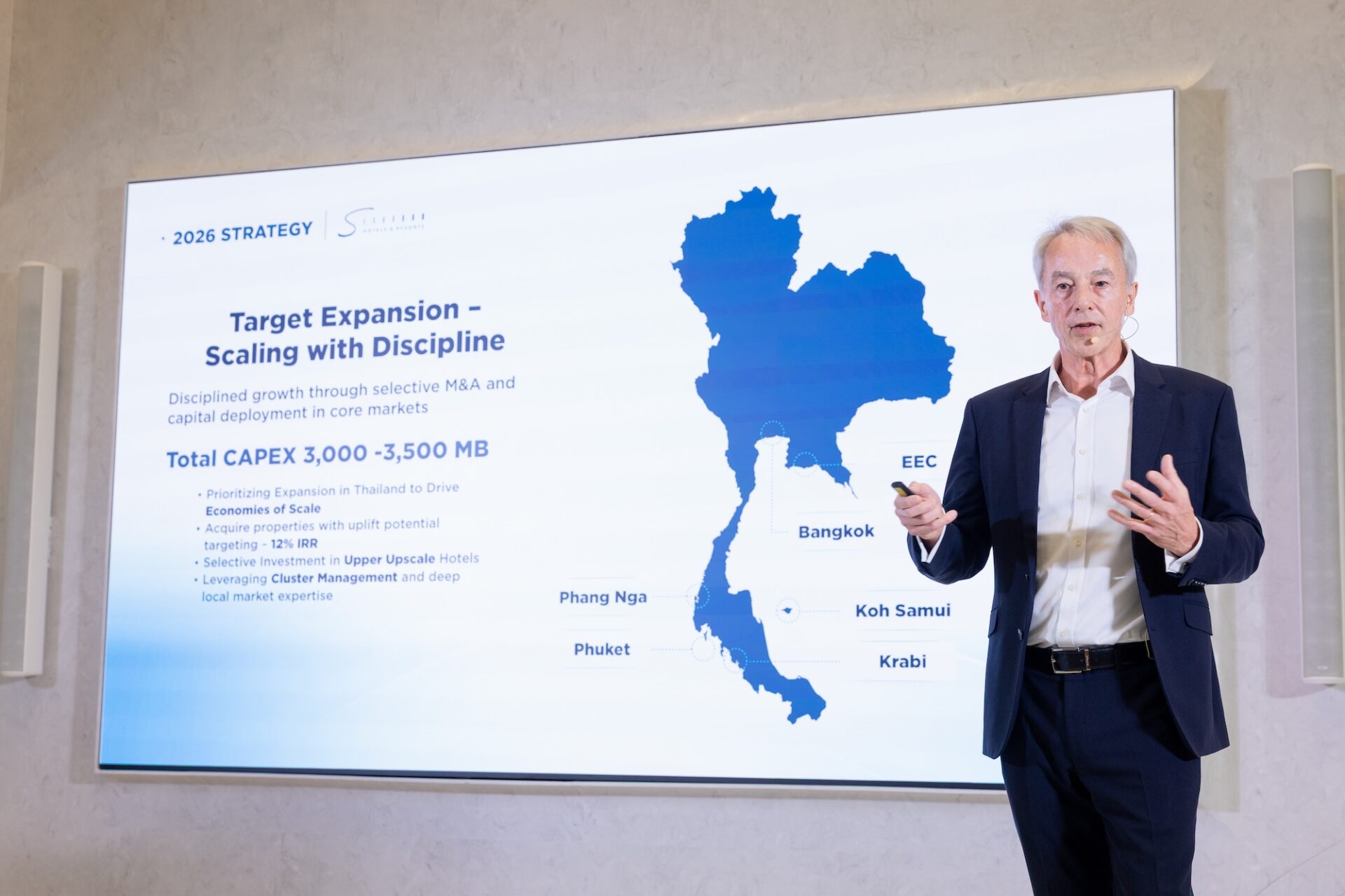 ในปี 2569 บริษัทวาง 3 กลยุทธ์หลักในการขับเคลื่อนธุรกิจ โดย กลยุทธ์แรก “STRENGTHEN THE PROFIT ENGINE” มุ่งเสริมความแข็งแกร่งของฐานกำไรจากธุรกิจที่สร้างรายได้ประจำ (Recurring Income) ได้แก่ ธุรกิจโรงแรมและธุรกิจอสังหาริมทรัพย์เพื่อการค้า ซึ่งสร้างรายได้รวมกันราว 70% ของพอร์ตโฟลิโอ โดยธุรกิจโรงแรมที่บริหารงานผ่านบริษัท เอส โฮเทล แอนด์ รีสอร์ท จำกัด (มหาชน) หรือ “SHR” ในปี 2568 ทำกำไรสุทธิปรับปรุงจากการดำเนินงาน (Normalised Net Profit) 615 ล้านบาท สูงสุดเป็นประวัติการณ์ ภายหลังจากโรงแรมที่บริษัท ปรับปรุงในช่วง 2-3 ปีที่ผ่านมาในประเทศไทยและสาธารณรัฐฟิจิ เปิดดำเนินการเต็มรูปแบบและได้รับการตอบรับอย่างดี โดยบริษัทใช้จุดแข็งในการทำธุรกิจโรงแรมเชิง “คุณภาพ” ของพอร์ตโฟลิโอที่เป็นรีสอร์ทเชิงพักผ่อน ปรับรูปแบบบริการให้ตอบโจทย์นักท่องเที่ยวยุคใหม่ที่มองหาประสบการณ์เชิงคุณภาพ ใส่ใจสุขภาวะและเน้นความรับผิดชอบต่อสิ่งแวดล้อม โดยคาดการณ์ว่าธุรกิจโรงแรมจะสามารถรักษาความสามารถในการทำกำไรในระดับนี้เพื่อเป็นฐานกำไรใหม่ของบริษัท พร้อมเตรียมเดินหน้าเพิ่มมูลค่าสินทรัพย์ (Asset Enhancement) อื่นๆ เช่น โรงแรมในประเทศมัลดีฟส์และสหราชอาณาจักร เพื่อยกระดับราคาค่าห้องพักและเสริมฐานกำไรจากธุรกิจรายได้ประจำให้บริษัทต่อไป
