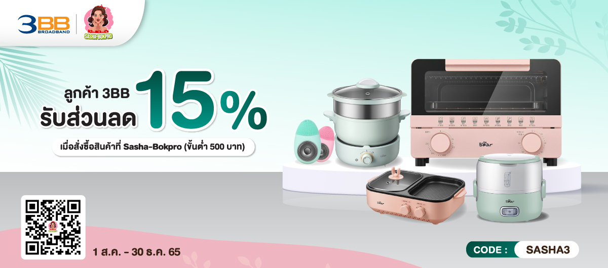 จำหน่ายสินค้าออนไลน์ในเครือบริษัท คิวรอน ภายใต้แบรนด์ Lesasha, Jason, Bear, Sparkle, Emjoi, @Home, Smoothskin ลูกค้า 3BB รับส่วนลด 15% เมื่อสั่งซื้อสินค้าที่ Sasha-Bokpro (ขั้นต่ำ 500 บาท)เพียงกรอก Code : SASHA3 ที่ www.sasha-bokpro.com เพื่อรับสิทธิ์ ถึง 30 ธันวาคม 2565