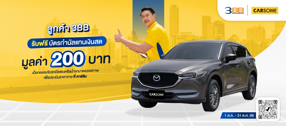 ซื้อและขายรถบ้านสภาพดี มีประกัน ในราคาดีที่สุดกับ CARSOME ลูกค้า 3BB รับฟรี! บัตรกำนัลแทนเงินสด 200 บาท เมื่อทดลองขับรถมือสองหรือนำรถมาตรวจสภาพเพื่อประเมินราคาขาย วิธีการรับสิทธิ์เพียงโชว์สื่อโปรโมทที่ CARSOME ทุกสาขาที่ร่วมรายการ ถึง 31 ตุลาคม 2566