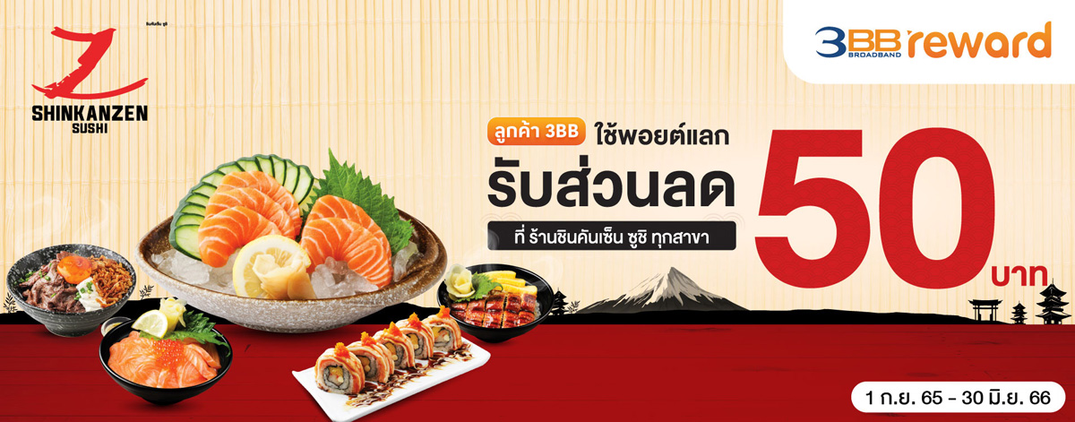 ซูชิคุณภาพ ขึ้นชื่อเรื่องความอร่อย ในราคาสุดฟิน ลูกค้า 3BB ใช้ 100 พอยต์ แลกรับส่วนลด 50 บาท ที่ร้านชินคันเซ็น ซูชิ ทุกสาขา กดรับรหัสเพื่อใช้สิทธิ์ได้ที่ 3BB Member Application ถึง 30 มิถุนายน 2566 หรือจนกว่าจำนวนสิทธิ์หมดลง