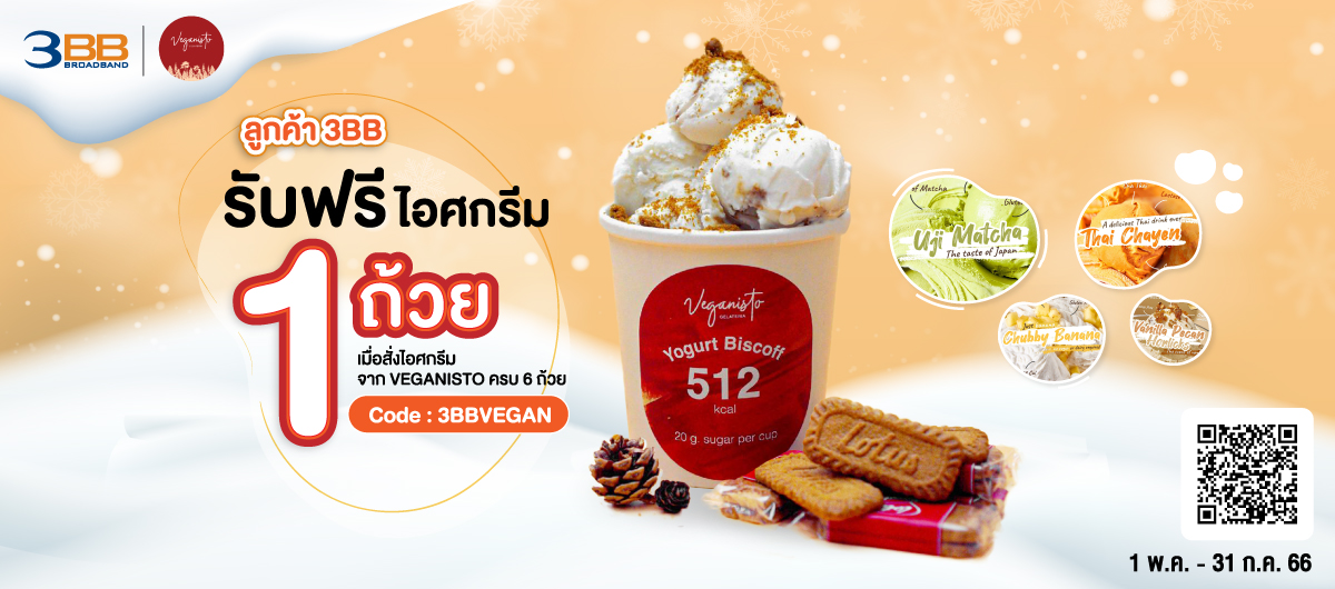 ไอศกรีมเจลาโตแบบวีแกน ที่รับประทานได้อย่างสบายใจ ไม่ต้องห่วงเรื่องสุขภาพ ลูกค้า 3BB รับฟรี 1ถ้วย เมื่อสั่งไอศกรีมจาก VEGANISTO 6 ถ้วย เพียงโชว์สื่อประชาสัมพันธ์และแจ้ง Code: 3BBVEGAN เพื่อรับสิทธิ์ผ่านทาง LINE ของทางร้าน (@veganisto) ถึง 31 กรกฎาคม 2566