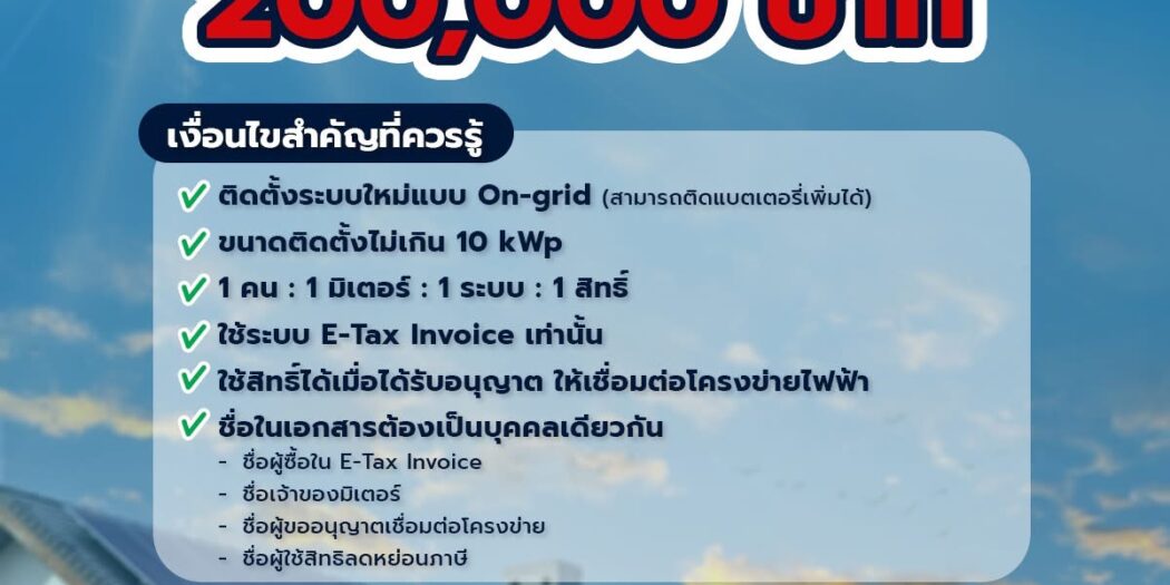 มาตรการดังกล่าวเปิดโอกาสให้เจ้าของบ้านสามารถ นำค่าใช้จ่ายจากการติดตั้งโซลาร์เซลล์ไปใช้ลดหย่อนภาษีเงินได้บุคคลธรรมดา ได้สูงสุดไม่เกิน 200,000 บาท นับเป็นอีกหนึ่งแรงจูงใจสำคัญในการเปลี่ยนผ่านสู่พลังงานสะอาด