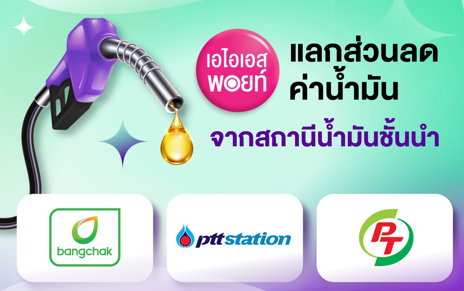 - สถานีบริการน้ำมันบางจาก รับส่วนลดค่าน้ำมันสูงสุด 150 บาท/เดือน สำหรับลูกค้าเอ็มเมอรัลด์, โกลด์ และแพลทินัม ใช้ AIS Points รับส่วนลดสูงสุด 100 บาท/เดือน เมื่อเติมน้ำมันที่สถานีบริการน้ำมันบางจาก เติม 50 ลิตรขึ้นไป ใช้ 50 คะแนน รับส่วนลด 25 บาท เติม 40–49 ลิตร ใช้ 40 คะแนน รับส่วนลด 20 บาท เติม 30–39 ลิตร ใช้ 30 คะแนน รับส่วนลด 15 บาท หรือเติม 20–29 ลิตร ใช้ 20 คะแนน รับส่วนลด 10 บาท ตั้งแต่วันนี้ – 31 ธันวาคม 2569