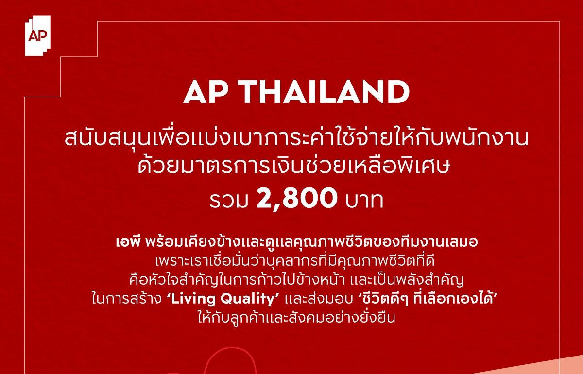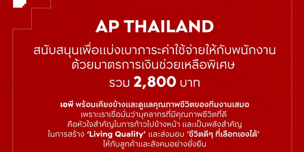 เอพี ไทยแลนด์ เดินหน้าเคียงข้างดูแลคุณภาพชีวิตพนักงาน สนับสนุนเงินช่วยเหลือพิเศษเดือนเมษายน รวม 2,800 บาท ร่วมเป็นส่วนหนึ่งเพื่อแบ่งเบาภาระค่าใช้จ่าย