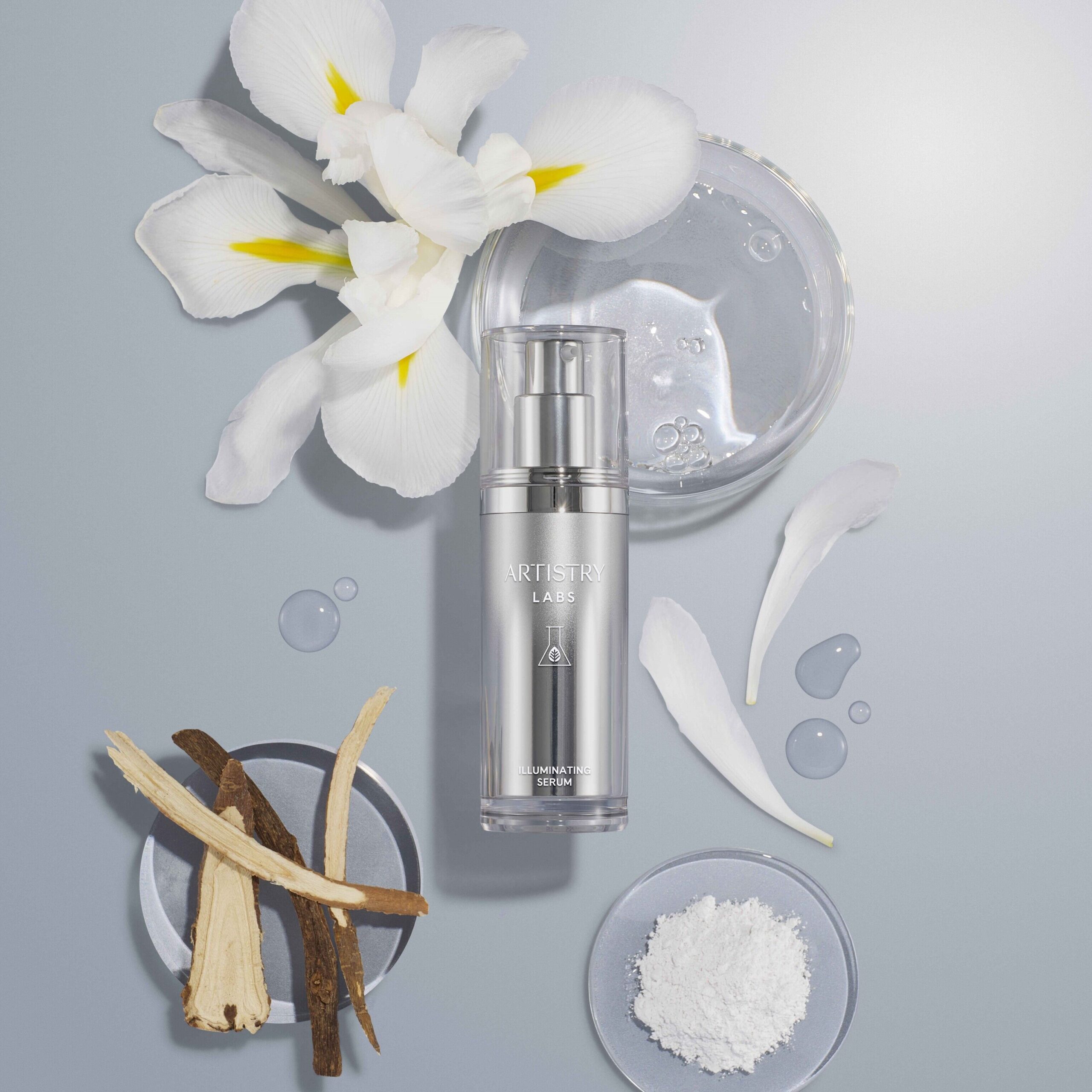 อาร์ทิสทรี แลบส์ อิลลูมิเนทติ้ง เซรั่ม (Artistry Labs Illuminating Serum) ผลิตภัณฑ์เซรั่มบำรุงผิวหน้ากลุ่มไวท์เทนนิ่งสูตรเข้มข้น ถูกคิดค้นและออกแบบ เพื่อผลลัพธ์ผิวกระจ่างใส ช่วยลดเลือนจุดด่างดำ มาพร้อมเทคโนโลยีสุดล้ำผสานส่วนผสมทางวิทยาศาสตร์ อย่าง ไซทิดีน อิลลูมิเนทติ้ง คอมเพล็กซ์ ช่วยจัดการกับเม็ดสีเมลานินในระดับสูง ประกอบด้วย ไซทิดีน ส่วนผสมไวท์เทนนิ่ง ที่อาร์ทิสทรีได้ร่วมศึกษาและพัฒนามายาวนานกว่า 10 ปี และจดสิทธิบัตรกับมหาวิทยาลัย Yale มีประสิทธิภาพสูงกว่าสารไวท์เทนนิ่งในท้องตลาดถึง 40%** ซึ่งช่วยลดเลือนจุดด่างดำฝังลึกอย่างมีประสิทธิภาพ เอเอทูจี วิตามินซีสังเคราะห์ ช่วยลดการสร้างเม็ดสีเมลานิน ทำให้ผิวดูกระจ่างใส และ ไนอาซินาไมด์ ช่วยลดการเกิดจุดด่างดำ ปรับสีผิวให้สม่ำเสมอ รวมถึงสารสกัดจากธรรมชาติ อย่าง ไฟโตนิวเทรียนท์ ที่คัดสรรอย่างพิถีพิถัน ประกอบด้วย ไอริสฟลอเรนตินา เพาะปลูกจากฟาร์มออร์แกนิกนิวทริไลท์ ช่วยปรับสีผิวให้กระจ่างใสมากกว่า AA2G ถึง 10 เท่า*** รากลิโคริช ช่วยปลอบประโลมผิว ลดการระคายเคือง และ ดอกแคคตัส ช่วยเสริมการผลัดเซลล์ผิว