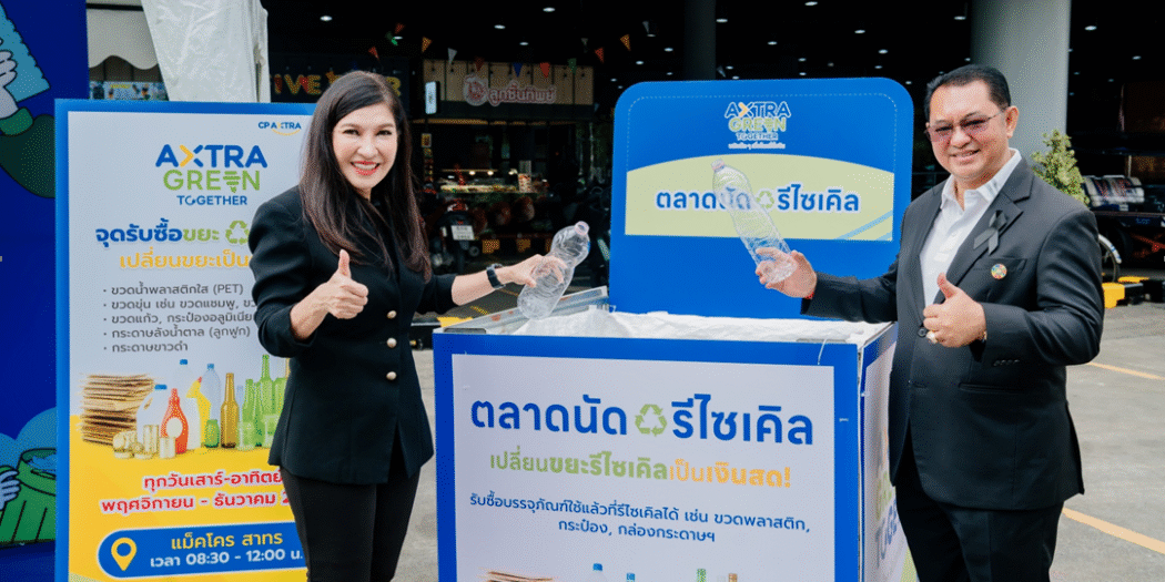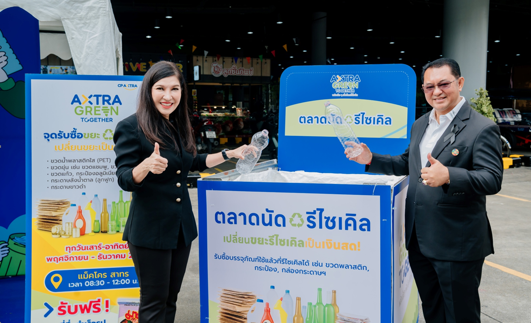 บริษัท ซีพี แอ็กซ์ตร้า จำกัด (มหาชน) ผู้ดำเนินธุรกิจค้าส่งค้าปลีก ‘แม็คโคร-โลตัส’ เดินหน้าสร้างความยั่งยืน ผ่านแคมเปญ “AXTRA Green Together” ภายใต้แนวคิด ‘พลังเล็ก ๆ เพื่อโลกที่ยั่งยืน ผ่านการคัดแยกขยะ โดยล่าสุด ร่วมกับ บริษัท เวสท์บาย เดลิเวอรี่ จำกัด เปิดตัวกิจกรรม “Weekend Recycle Market ตลาดนัดรีไซเคิล ‘รักษ์โลก สร้างรายได้’” เพื่อส่งเสริมการคัดแยกขยะอย่างถูกวิธี ทุกวันเสาร์-อาทิตย์ จนถึงสิ้นปี 2568 ที่แม็คโครและโลตัส 10 สาขาในกรุงเทพฯ พร้อมกันนี้ ยังได้จัดทำโครงการ “RVM by CP AXTRA x Wastebuy” เพื่อติดตั้งเครื่องรับคืนบรรจุภัณฑ์อัตโนมัติ (Reverse Vending Machine – RVM) ในการอำนวยความสะดวกให้ประชาชนสามารถนำขวดพลาสติก มาส่งคืนได้ตลอดเวลา พร้อมรับคะแนนสะสมผ่านระบบดิจิทัล โดยขวดที่เก็บรวบรวมจะถูกนำเข้าสู่กระบวนการรีไซเคิลต่อเนื่อง เพื่อสร้างเศรษฐกิจหมุนเวียนและทรัพยากรที่ยั่งยืน โดยมี นายพรพรหม วิกิตเศรษฐ์ ผู้บริหารด้านความยั่งยืนของกรุงเทพมหานคร และ ที่ปรึกษาของผู้ว่าราชการกรุงเทพมหานคร และ ดร.ผานิต รัตสุข ผู้อำนวยการกองจัดการกากของเสียและสารอันตราย กรมควบคุมมลพิษ ให้เกียรติร่วมงานเปิดตัวกิจกรรม