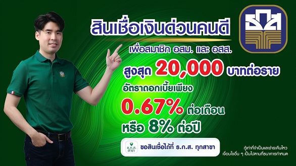 ธ.ก.ส. จัด 10,000 ล้านบาท ให้สมาชิก อสม. และ อสส. ผ่านโครงการสินเชื่อเงินด่วนคนดี เพื่อสนับสนุนการเข้าถึงแหล่งเงินทุนในการอุปโภคบริโภคแทนการกู้เงินนอกระบบ อัตราดอกเบี้ยร้อยละ 0.67 ต่อเดือน ลดต้นลดดอก ผ่อนชำระไม่เกิน 4 ปี ติดต่อได้วันนี้ที่ ธ.ก.ส. ทุกสาขา