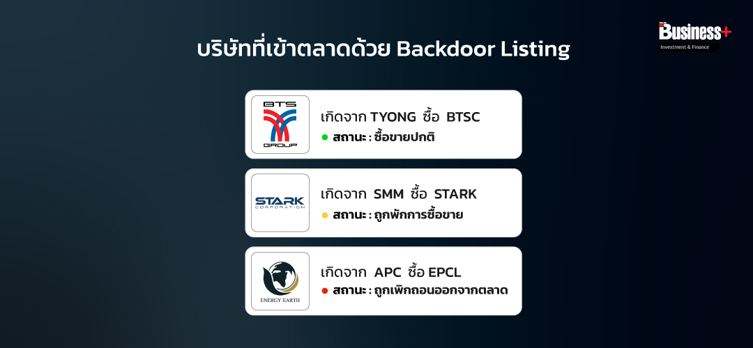 โดยในตลาดหุ้นไทยมีกรณีการ Backdoor Listing ใหญ่ๆ ที่เป็นที่พูดถึงมากมาย 3 บริษัท นั่นคือ