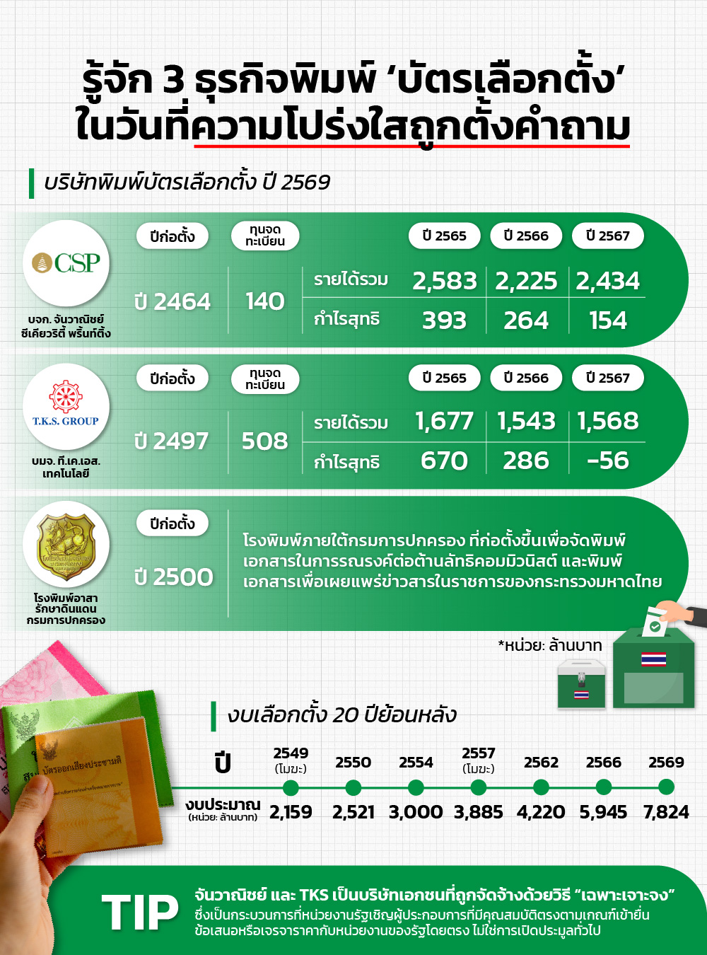 เริ่มกันที่ บริษัท จันวาณิชย์ ซีเคียวริตี้ พริ้นท์ติ้ง จำกัด มีเจ้าของคือ ตระกูลกองบุญมา เป็นผู้พิมพ์บัตร ส.ส. แบบบัญชีรายชื่อ (สีชมพู) จำนวน 56.1 ล้านฉบับ ด้วยวงเงิน 81.34 ล้านบาท คิดเป็นใบละ 1.4 บาท จุดแข็งของบริษัทอยู่ที่ประสบการณ์กว่า 105 ปี ในอุตสาหกรรมสิ่งพิมพ์ป้องกันการปลอมแปลง ครอบคลุมงานระดับชาติ เช่น หนังสือเดินทาง ธนบัตร สลาก และเอกสารราชการสำคัญ โดยรายได้ปี 2567 อยู่ที่ 2,434 ล้านบาท กำไรสุทธิ 154 ล้านบาท สะท้อนฐานะการเงินมั่นคงและความสามารถรองรับงานสเกลใหญ่
