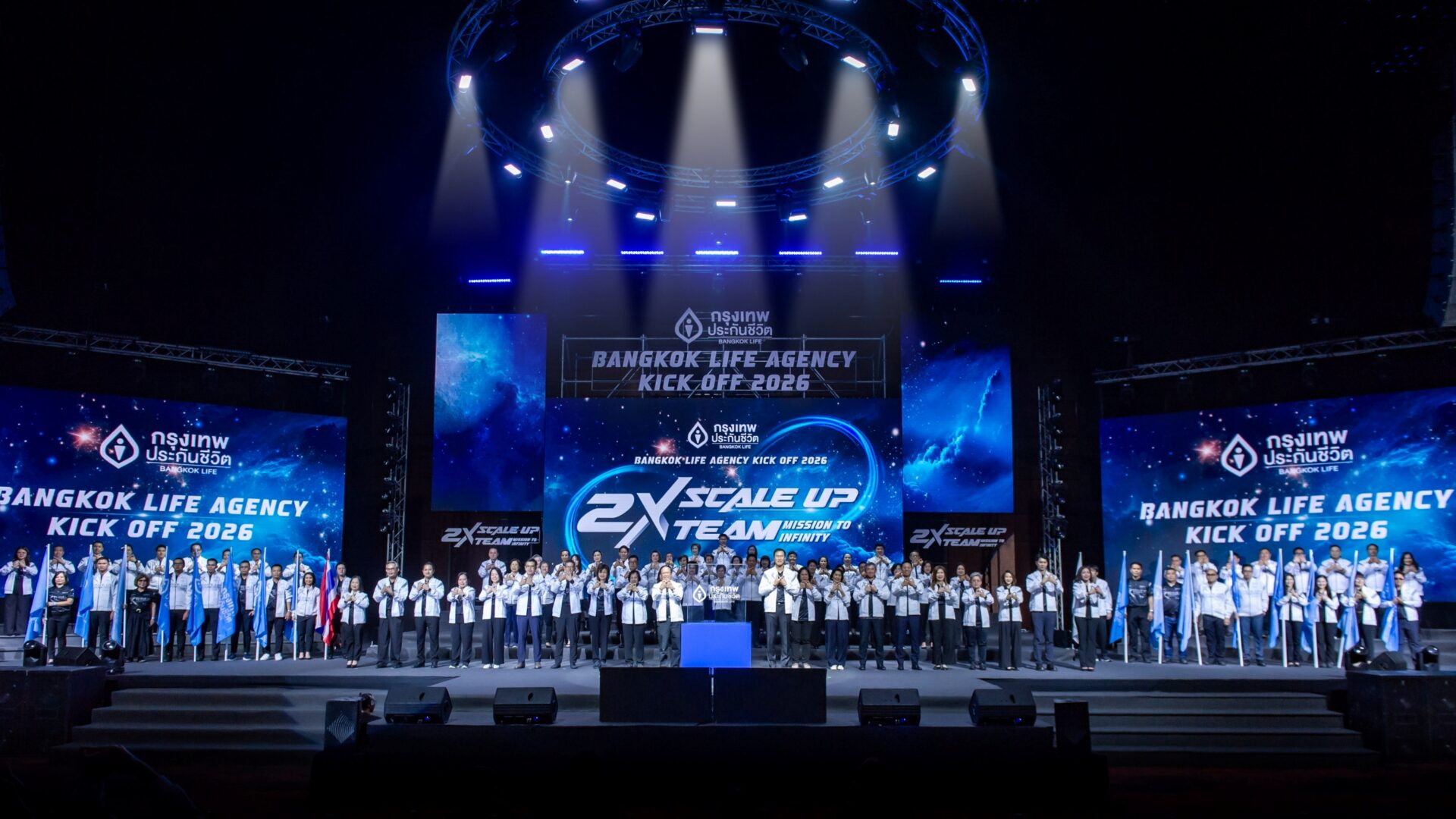 กรุงเทพประกันชีวิต เปิดศักราชใหม่ 2569 จัดงานยิ่งใหญ่แห่งปี Bangkok Life Agency Kick Off 2026 ตั้งเป้าหมายสร้างการเติบโตแบบสองเท่า 2X Scale Up Team: Mission to Infinity ผ่านตัวแทนประกันชีวิตและที่ปรึกษาการเงิน โดยวางเป้าหมายยกระดับช่องทางตัวแทนฯ อย่างเป็นระบบ ทั้งการเพิ่มศักยภาพคน ทีมงาน และระบบสนับสนุนต่างๆ พร้อมปักธงนโยบายสร้าง ‘Life Care Partner’ ที่ใส่ใจลูกค้ารอบด้าน ตามวิสัยทัศน์มุ่งสู่การเป็นบริษัทประกันชีวิตอันดับหนึ่งด้านความใส่ใจสู่การเติบโตอย่างยั่งยืนในระยะยาว โดยมี ดร.ศิริ การเจริญดี ประธานกรรมการ นายโชน โสภณพนิช กรรมการผู้จัดการใหญ่และประธานเจ้าหน้าที่บริหาร นายจักรพงศ์ แสงแก้ว ผู้ช่วยผู้จัดการใหญ่ สายงานตัวแทนและที่ปรึกษาทางการเงิน พร้อมด้วย กรรมการบริหาร ผู้บริหารระดับสูง และ ผู้บริหารตัวแทนประกันชีวิต และที่ปรึกษาการเงิน รวมถึงตัวแทนประกันชีวิต จากทั่วประเทศร่วมงานกว่า 1,500 คน ร่วมงาน ณ ทรู ไอคอน ฮอลล์ ไอคอนสยาม