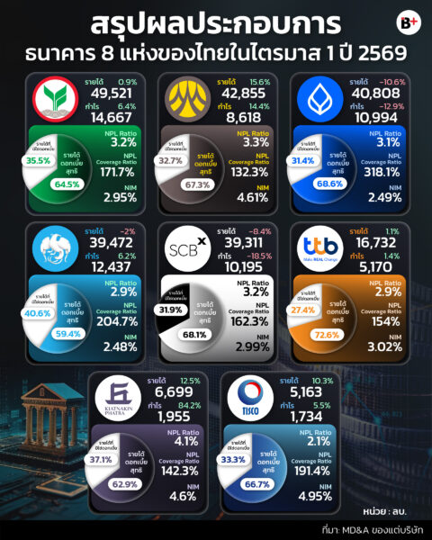 ไตรมาส 1 ปี 2569 ผลประกอบการธนาคาร 8 แห่งในตลาดหุ้นไทยไม่ได้ไปในทิศทางเดียวกันทั้งหมด โดยธนาคารอย่างกรุงศรีและกลุ่มขนาดเล็กบางแห่งยังเติบโตได้ดี ขณะที่ธนาคารกรุงเทพหรือ SCBX รายได้และกำไรลดลง