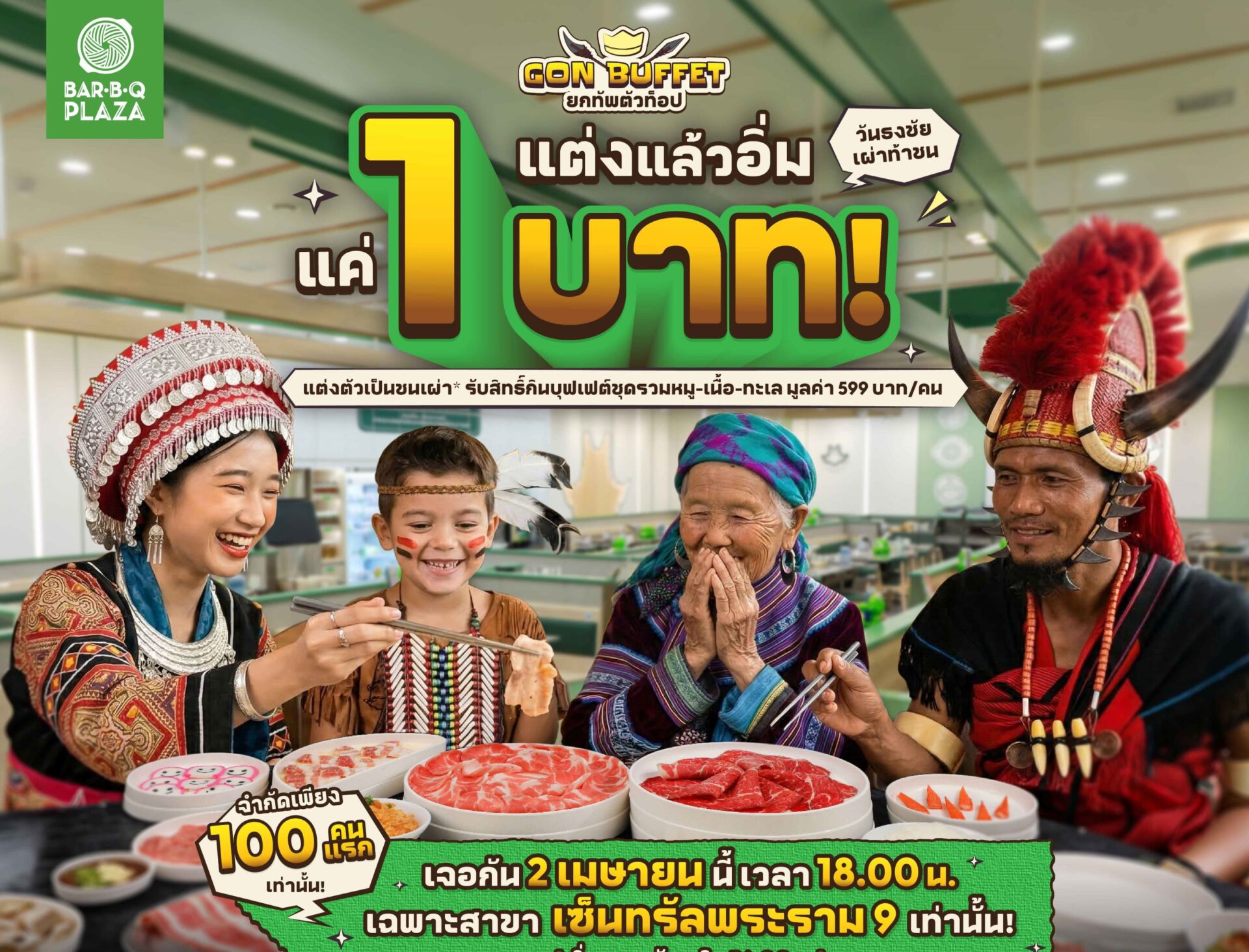พี่ GON เติมสีสันช่วงโค้งสุดท้ายของโปรโมชัน “GON BUFFET ยกทัพตัวท็อป” ชวนแฟน ๆ มารวมพลในกิจกรรมพิเศษ “วันธงชัยเผ่าท้าชน” เปิดพื้นที่ให้แต่ละเผ่าแต่งชุดโชว์ไอเดียกันแบบจัดเต็ม ทั้งคอสตูมและเครื่องหัว พร้อมมอบสิทธิ์ 100 ท่านแรก ให้คุ้มสุดๆ กับ GON BUFFET ชุดรวมหมู เนื้อ และทะเล ที่รวมข้าว เครื่องดื่ม และไอศกรีมไม่อั้น ในราคาเพียง 1 บาท NET/คน จากปกติ 599 บาท NET/คน โดยกิจกรรมจัดขึ้น วันเดียว รอบเดียว ในวันที่ 2 เมษายน 2569 เฉพาะที่ ร้านบาร์บีคิวพลาซ่าสาขาเซ็นทรัล พระราม 9 เท่านั้น