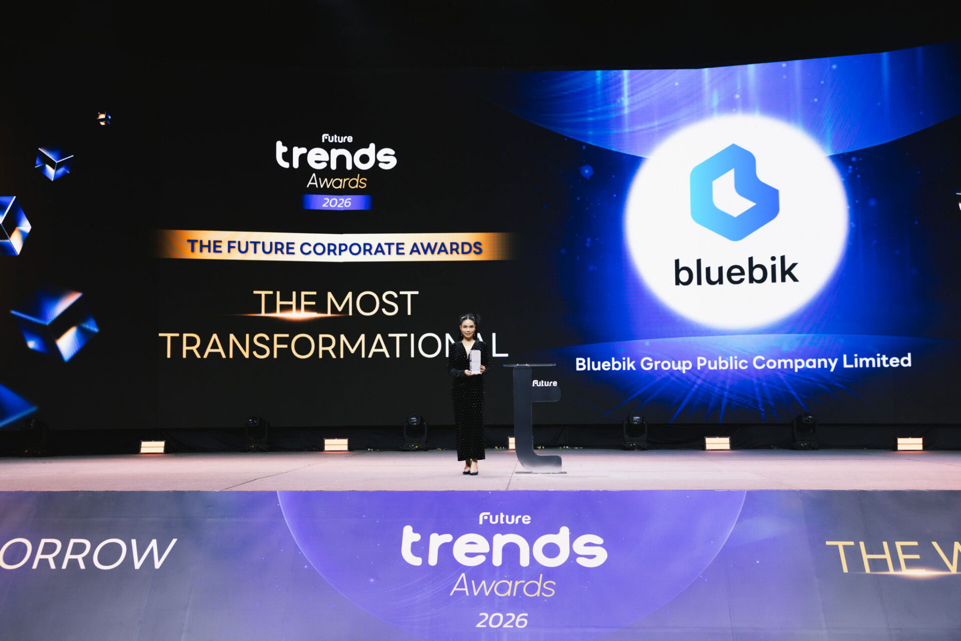 บริษัท บลูบิค กรุ๊ป จํากัด (มหาชน) หรือ BBIK ที่ปรึกษาชั้นนำด้านดิจิทัลทรานส์ฟอร์เมชันระดับองค์กรธุรกิจ (Digital Enterprise Transformation) นำโดย นางสาวพิมพ์วิสาข์ เทียนศรี ประธานเจ้าหน้าที่การตลาด รับมอบรางวัล The Most Transformational จากเวที Future Trends Awards 2026 ซึ่งเป็นรางวัลที่ยกย่ององค์กรที่มีความโดดเด่นด้านการขับเคลื่อนการเปลี่ยนแปลงเชิงกลยุทธ์ สามารถนำเทคโนโลยีเข้ามาประยุกต์ใช้เพื่อช่วยในการ เปลี่ยนผ่านธุรกิจและอุตสาหกรรมอย่างมีนัยสำคัญ ตลอดจนสร้างผลลัพธ์เชิงประจักษ์ ทั้งด้านการเติบโตทางธุรกิจ ประสิทธิภาพองค์กร และผลกระทบเชิงบวกต่อความสามารถการแข่งขันในระยะยาว