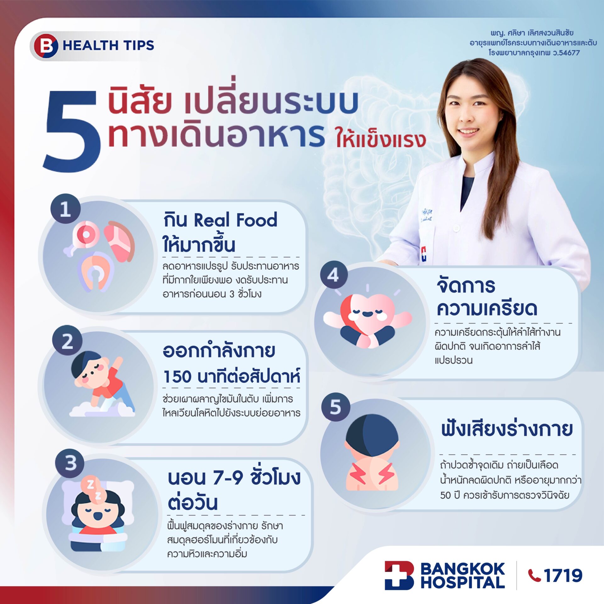 พญ. ศลิษา เลิศสงวนสินชัย อายุรแพทย์โรคระบบทางเดินอาหารและตับ โรงพยาบาลกรุงเทพ กล่าวปิดท้ายถึงเรื่องระบบทางเดินอาหารไว้ว่า