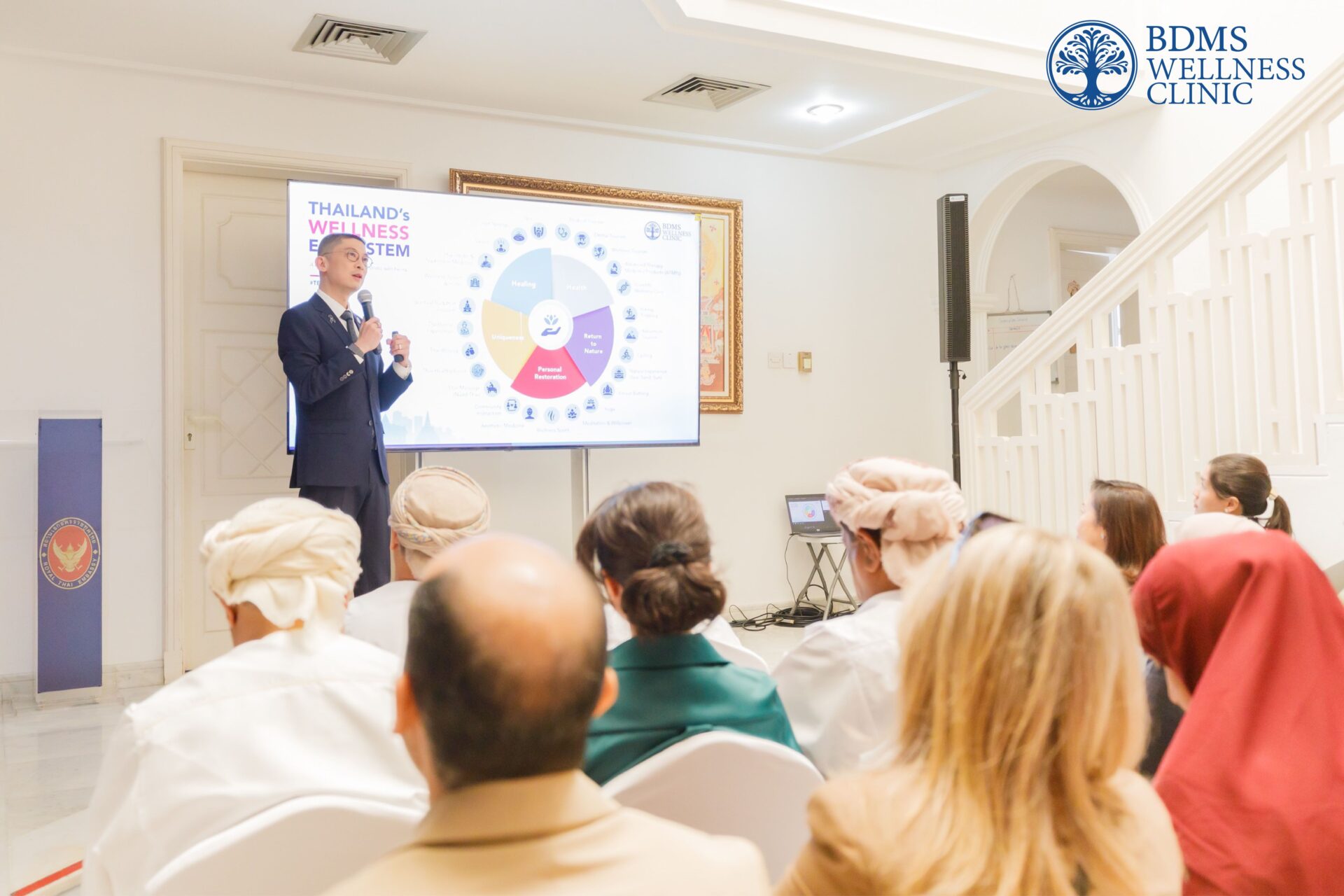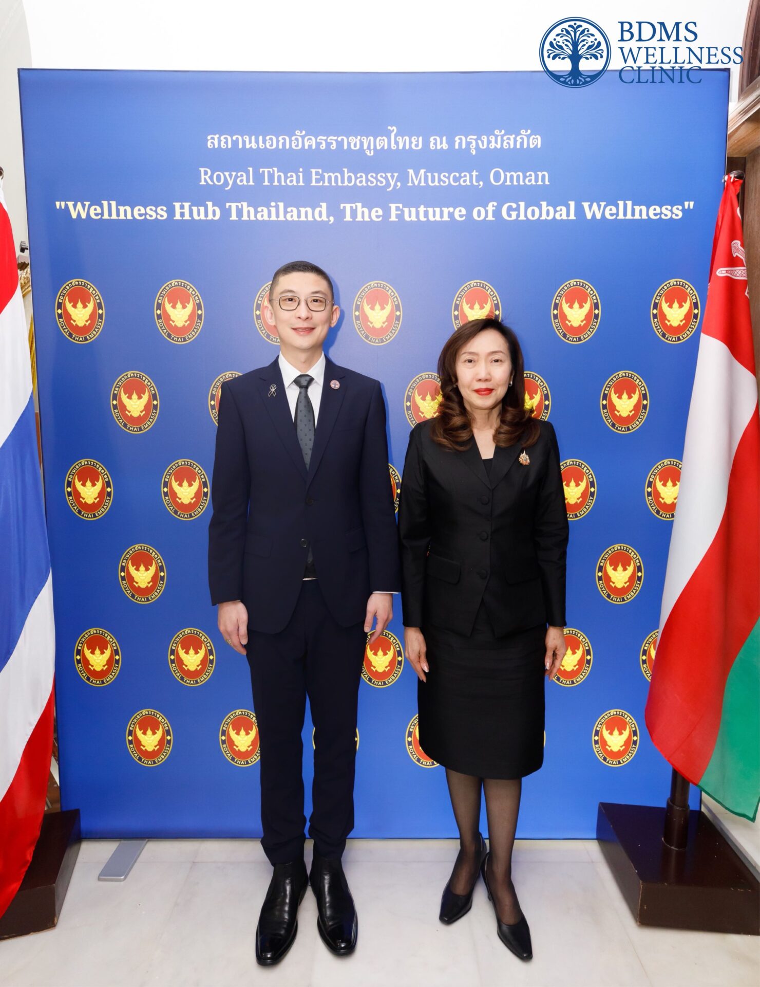 บีดีเอ็มเอส เวลเนส คลินิก (BDMS Wellness Clinic) ศูนย์สุขภาพเชิงป้องกันในเครือบริษัท กรุงเทพดุสิตเวชการ จำกัด (มหาชน) นำโดย นายแพทย์ ตนุพล วิรุฬหการุญ ประธานคณะผู้บริหาร บีดีเอ็มเอส เวลเนส คลินิก และ บีดีเอ็มเอส เวลเนส รีสอร์ท บริษัท กรุงเทพดุสิตเวชการ จำกัด (มหาชน) ได้รับเกียรติจาก นางสาววารุณี ปั้นกระจ่าง เอกอัครราชทูต ณ กรุงมัสกัต รัฐสุลต่านโอมาน เพื่อหารือแนวทางสานต่อความร่วมมือด้านสุขภาพระหว่างไทยและโอมาน ภายใต้แนวคิด “Health Vision 2050” ณ สถานเอกอัครราชทูต ณ กรุงมัสกัต รัฐสุลต่านโอมาน ซึ่งเป็นวิสัยทัศน์ระยะยาวด้านระบบสุขภาพของโอมานในมิติที่สำคัญ ทั้งด้านการเงินสุขภาพ การพัฒนาทรัพยากรบุคคล การให้บริการทางการแพทย์ เทคโนโลยี และผลิตภัณฑ์ทางการแพทย์ ซึ่งสอดคล้องกับพันธกิจและวิสัยทัศน์ Wellness Hub Thailand ของนายแพทย์ตนุพล ในการผลักดัน Wellness Tourism ของไทยสู่ระดับสากล พร้อมผลักดันประเทศไทยให้เป็น Wellness Hub ระดับโลก