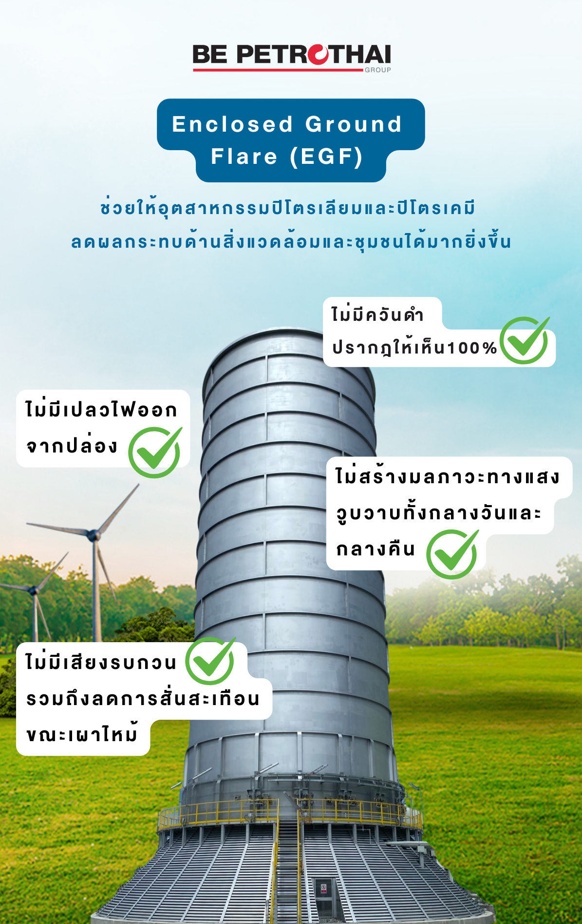 หอเผาระดับพื้นดินแบบปิด (EGF) ที่กลุ่มบริษัท บี ปิโตรไทยนำมาติดตั้งให้แก่ลูกค้า เป็นเทคโนโลยีล่าสุดจาก John Zink  หนึ่งในผู้นำระดับโลกด้านเทคโนโลยีการเผาไหม้ ที่ตอบโจทย์การพัฒนาอย่างยั่งยืน  โดยมีจุดเด่น 4 ด้านหลัก ได้แก่ ไม่มีควันดำปรากฎให้เห็น 100%  ไม่มีเปลวไฟออกจากปล่อง  ไม่สร้างมลภาวะทางแสงวูบวาบทั้งกลางวันและกลางคืน  และไม่มีเสียงรบกวน รวมถึงลดการสั่นสะเทือนขณะเผาไหม้