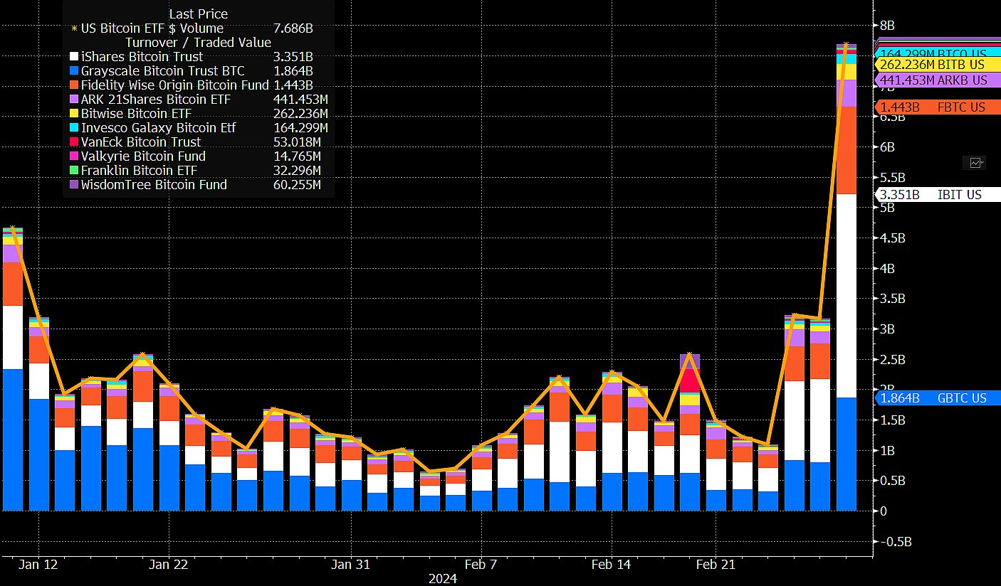 รายงานจาก Cointelegraph ระบุว่าปริมาณซื้อขายกองทุน Spot Bitcoin ETF ในสหรัฐฯ ได้ทำลายสถิติใหม่ โดยมียอดซื้อขายสูงถึง 7.69 พันล้านดอลลาร์สหรัฐฯ เมื่อวันที่ 29 กุมภาพันธ์ พ.ศ. 2567 จากสถิติเดิมที่ 4.66 พันล้านดอลลาร์เมื่อวันที่ 11 มกราคม พ.ศ. 2567 นำโดยกองทุน iShares Bitcoin ETF ของ BlackRock ที่มียอดซื้อขายสูงถึง 3.35 พันล้านดอลลาร์ ตามมาโดย Grayscale Bitcoin Trust ที่ 1.86 พันล้านดอลลาร์ และ Fidelity Wise Origin Bitcoin Fund ที่ 1.44 พันล้านดอลลาร์