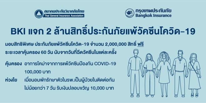 ผู้ติดเชื้อเป็นจำนวนมาก และมีความรุนแรงทำให้มีผู้เสียชีวิตเพิ่มขึ้น บริษัท กรุงเทพประกันภัย จำกัด (มหาชน) หรือ BKI จึงได้จัดโครงการ BKI แจก 2 ล้านสิทธิ์ประกันภัยแพ้วัคซีนโควิด-19 ภายใต้การประสานความร่วมมือกับสมาคมประกันวินาศภัยไทย โดยบริษัทฯ มอบกรมธรรม์ประกันภัยแพ้วัคซีนโควิด-19 ให้แก่ประชาชนทั่วไปจำนวน 2,000,000 สิทธิ์ ที่ให้ความคุ้มครองภาวะโคม่า สูงสุด 100,000 บาท