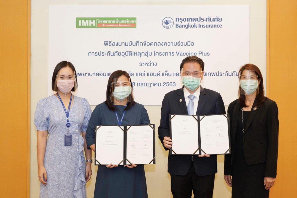 บริษัท กรุงเทพประกันภัย จำกัด (มหาชน) หรือ BKI โดยนางสาวปวีณา จูชวน (ที่ 2 จากซ้าย) ผู้ช่วยกรรมการผู้อำนวยการใหญ่ และนางสาวลสา โสภณพนิช (ซ้ายสุด) ผู้อำนวยการ ธุรกิจนายหน้า และบริษัท โรงพยาบาลอินเตอร์เมดิคัล แคร์ แอนด์ แล็บ จำกัด (มหาชน) หรือ IMH โดยดร.สิทธิวัตน์ กำกัดวงษ์ (ที่ 2 จากขวา) ประธานเจ้าหน้าที่บริหาร และนางสาวปรมาภรณ์ ปวโรจน์กิจ (ขวาสุด) รองประธานเจ้าหน้าที่บริหาร ร่วมลงนามบันทึกข้อตกลงความร่วมมือในโครงการ Vaccine Plus ซึ่งจะมอบประกันอุบัติเหตุและสิทธิประโยชน์ให้แก่ลูกค้าในโครงการดังกล่าว ณ อาคารกรุงเทพประกันภัย สำนักงานใหญ่ ถนนสาทรใต้ เมื่อวันที่ 8 กรกฎาคม 2563