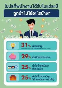 จากการสำรวจการใช้โบนัสของพนักงาน พบว่า 31% ของผู้ตอบแบบสำรวจนำไปลงทุน 29% บอกว่าเก็บไว้เป็นเงินออม และ 1 ใน 4 ของผู้ตอบแบบสำรวจ จะนำไปชำระหนี้และบัตรเครดิต และอีก 11% นำไปซื้อของขวัญให้ตนเองและคนสำคัญ