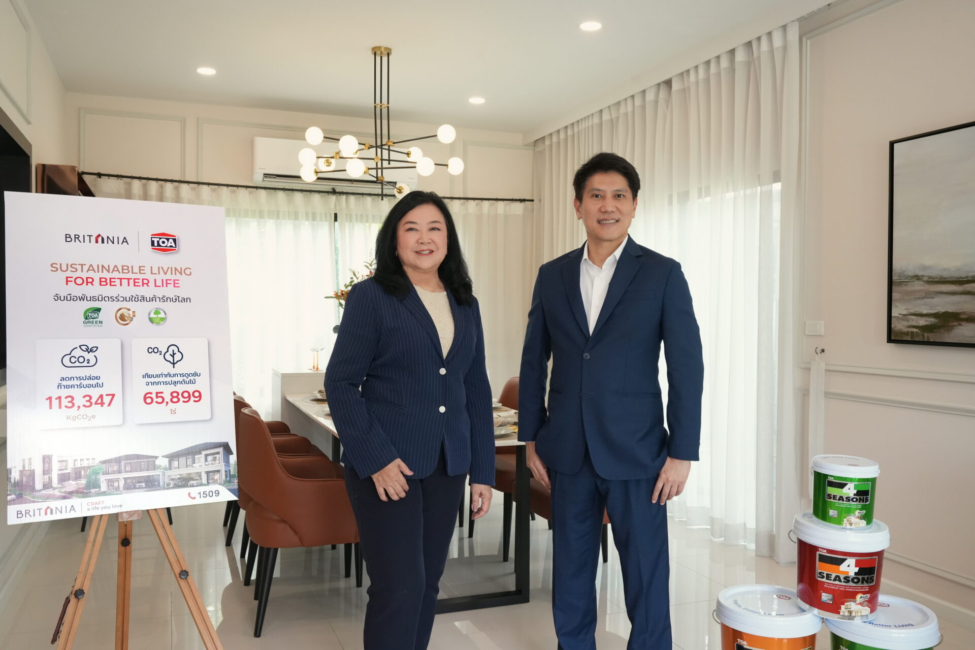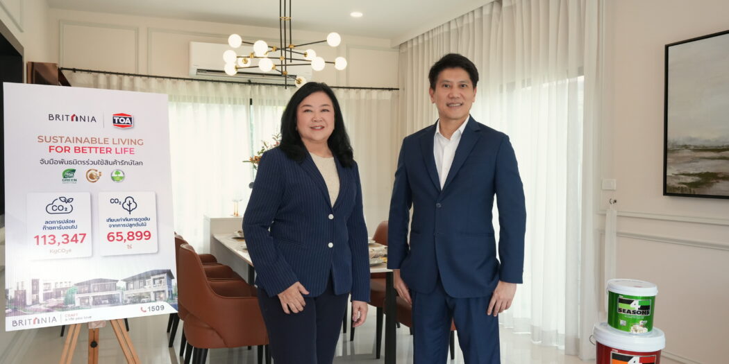 ดร.ศุภลักษณ์ จันทร์พิทักษ์ ประธานเจ้าหน้าที่บริหาร บริษัท บริทาเนีย จำกัด (มหาชน) หรือ BRI กล่าวว่าบริทาเนียยังคงมุ่งมั่นพัฒนาที่อยู่อาศัยเพื่อสังคมที่ดีอย่างยั่งยืน (ESG) ตั้งแต่จุดเริ่มต้นการออกแบบ การก่อสร้างการตกแต่ง ไปจนส่งมอบบ้านให้กับลูกค้า ด้วยการนำนวัตกรรม และเทคโนโลยีที่ใส่ใจต่อสิ่งแวดล้อมเข้ามาใช้ในโครงการบ้านจัดสรร ยกระดับคุณภาพชีวิตของผู้อยู่อาศัย เน้นพื้นที่สีเขียว ปลูกต้นไม้เพื่อกรองฝุ่น และดูดซับสารพิษภายในโครงการ โดยเลือกใช้วัสดุที่มุ่งเน้นคุณภาพเป็นมิตรต่อสิ่งแวดล้อม ประหยัดพลังงาน และช่วยลดโลกร้อน รวมถึงร่วมมือกับพันธมิตรองค์กรเอกชน ในการร่วมกันส่งมอบคุณค่าแห่งความยั่งยืน โดยล่าสุดได้ร่วมมือกับ ทีโอเอ ด้วยการเลือกใช้ผลิตภัณฑ์ TOA Pro Primer S8000 สีรองพื้นปูนใหม่กันด่างเกรดพรีเมียม และ TOA 4 SEASONS สีคุณภาพจากทีโอเอ สำหรับทาภายนอก ภายในและฝ้า ที่สามารถลดคาร์บอนได้ถึง 113,347 KgCO2e เทียบเท่าการดูดซับจากการปลูกต้นไม้ 65,899 ไร่ อีกทั้งฟิล์มสีสะท้อนร้อนมากกว่า 95% ลดอุณหภูมิได้มากกว่า 5 องศา ช่วยให้บ้านเย็นขึ้น และช่วยลดค่าไฟฟ้าภายในบ้าน ปลอดภัยต่อสุขภาพ