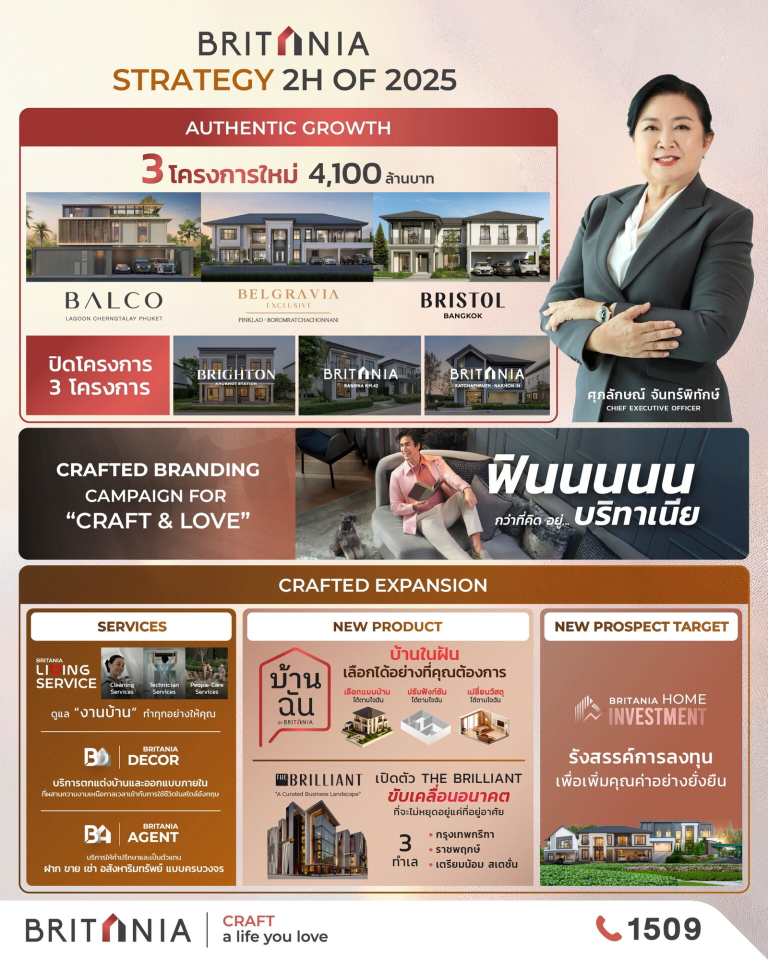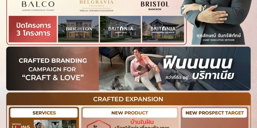 “บริทาเนีย” เดินหน้าเติบโตอย่างต่อเนื่องในครึ่งปีหลัง ตอกย้ำความเป็นผู้นำด้านการพัฒนาโครงการที่อยู่อาศัยแนวราบ ด้วยแนวทางการดำเนินงานที่ตอบโจทย์ทุกความต้องการของลูกค้าอย่างตรงกลุ่ม ผ่าน 3 แกนหลักสำคัญ ได้แก่ AUTHENTIC GROWTH STRATEGY, CRAFTED BRANDING CAMPAIGN FOR “CRAFT&LOVE” และ CRAFTED EXPANSION ซึ่งสะท้อนถึงวิสัยทัศน์ขององค์กรที่ก้าวข้ามกรอบเดิม มุ่งสร้างโอกาสใหม่แห่งการเติบโต และขยายฐานลูกค้าอย่างยั่งยืน