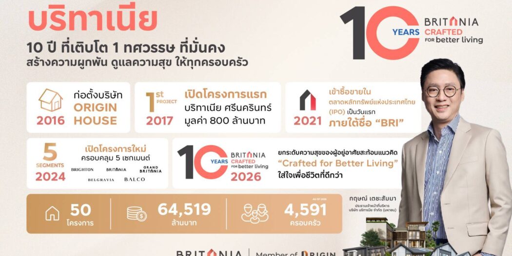 คุณกฤษณ์ เตชะสัมมา ประธานเจ้าหน้าที่บริหาร บริษัท บริทาเนีย จำกัด (มหาชน) เล่าย้อนกลับไปเมื่อ 10 ปีก่อนราวปี 2559 ว่า บริทาเนีย เปรียบเสมือนเหมือน New S-Curve ให้กับบริษัทแม่ คือ บริษัท ออริจิ้น พร็อพเพอร์ตี้ จำกัด (มหาชน) หรือ ORI ผู้พัฒนาคอนโดมิเนียมเป็นสินค้าหลัก ที่มีความต้องการจะขยายธุรกิจสู่ที่อยู่อาศัยแนวราบ (บ้านจัดสรร) ภายใต้บริษัท ออริจิ้น เฮ้าส์ จำกัด ด้วยทุนจดทะเบียน 1 ล้านบาท เลือกโลเคชันที่คุ้นเคย คือ ‘โซนตะวันออก’ เปิดโครงการแรกภายใต้ชื่อ “บริทาเนีย ศรีนครินทร์” เป็นโครงการบ้านเดี่ยวและบ้านแฝด 2 ชั้น จำนวน 149 ยูนิต เริ่มเปิดขายในเดือนพฤศจิกายน 2560 กระแสตอบรับดีมากใช้เวลาเพียงปีกว่า ๆ ในการปิดการขายโครงการ จากนั้นเดินเกมบุกต่อไม่หยุด ใช้สูตรทวีคูณเพิ่มพอร์ตไต่ระดับเติบโตและแบรนด์ “บริทาเนีย” เริ่มเป็นที่รู้จักในตลาดบ้านแนวราบ สู่การตัดสินใจเปลี่ยนชื่อจาก ออริจิ้น เฮ้าส์ มาเป็น “บริษัท บริทาเนีย จำกัด” ในปี 2562 เพื่อสะท้อนตัวตนของแบรนด์ และสร้างการรับรู้ของคำว่า “บริทาเนีย” ให้ชัดเจนยิ่งขึ้นในตลาดที่อยู่อาศัย ด้วยเอกลักษณ์ความเป็นบ้านสไตล์อังกฤษ