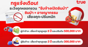 Read More »ทรูแจ้งเตือน! ระวังถูกหลอกชวน “รับจ้างเปิดซิมม้า” ซิมม้า = อาชญากรรม เสี่ยงคุก-ปรับหนัก