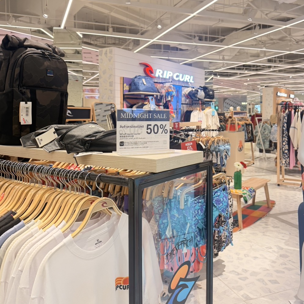 - สินค้าแฟชั่นวัยรุ่น ลดทุกไอเทม 20% – 50%* ได้แก่ LACOSTE • PAUL FRANK • NYLA • RIP CURL • NEW ERA • XLARGE • SCOTCH&SODA • EA7 ดีลพิเศษ สินค้าลดเฉพาะรุ่น ลดสูงสุด 50*% ได้แก่ ADIDAS • NIKE • PUMA • FILA • QUIKSILVER • ROXY • BILLABONG • NEW BALANCE • MLB • CONVERSE • VANS • CAMPER • KEDS • KEEN • CROCS • OOFOS • SUNGLASS HUT • MARVEL VISION • MARSHALL • SHOKZ • JBL สินค้า 1 แถม 1* ได้แก่ BAOJI • ROVING FOX • MUUNIQUE