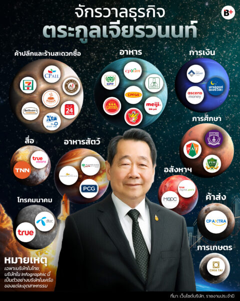 หนึ่งในตระกูลที่รวยที่สุดของไทยคงหนีไม่พ้นตระกูลเจียรวนนท์ ที่มีจุดเริ่มต้นจากธุรกิจจำหน่ายเมล็ดพันธุ์พืชชื่อร้าน เจียไต๋ จนมาวันนี้ขยายธุรกิจครอบคลุมตั้งแต่ต้นน้ำยันปลายน้ำ โดยวันนี้ Business+ ได้รวบรวมตัวอย่างแบรนด์และธุรกิจในแต่ละหมวดมาให้ดูกัน