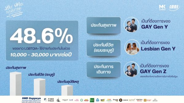 - ด้านสุขภาพและประกันภัย พบว่า 6% ของกลุ่ม LGBTQIA+ ใช้จ่ายกับประกันในช่วง 10,000-30,000 บาทต่อปี โดยประกันสุขภาพเป็นที่ต้องการของกลุ่ม Gay Gen Y มากที่สุด ประกันชีวิตแบบระบุผู้รับผลประโยชน์เป็นที่ต้องการของกลุ่ม Lesbian Gen Y มากที่สุด และประกันการเดินทางเป็นที่ต้องการของกลุ่ม Gay Gen Z มากที่สุด ซึ่งสอดคล้องกับความต้องการในการท่องเที่ยว ยิ่งไปกว่านั้นยังพบว่ากลุ่มเลสเบี้ยนสนใจบริการศัลยกรรมแปลงเพศ 8.7% มากกว่ากลุ่มเกย์ที่สนใจเพียง 3.5% และยังมีความต้องการบริการด้านสุขภาพจิต บริการด้านสุขภาพทางเพศสำหรับ LGBTQIA+และการตรวจสุขภาพทั่วไปอีกด้วย