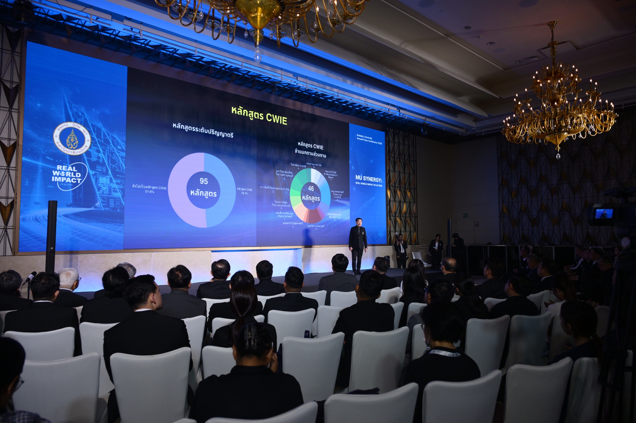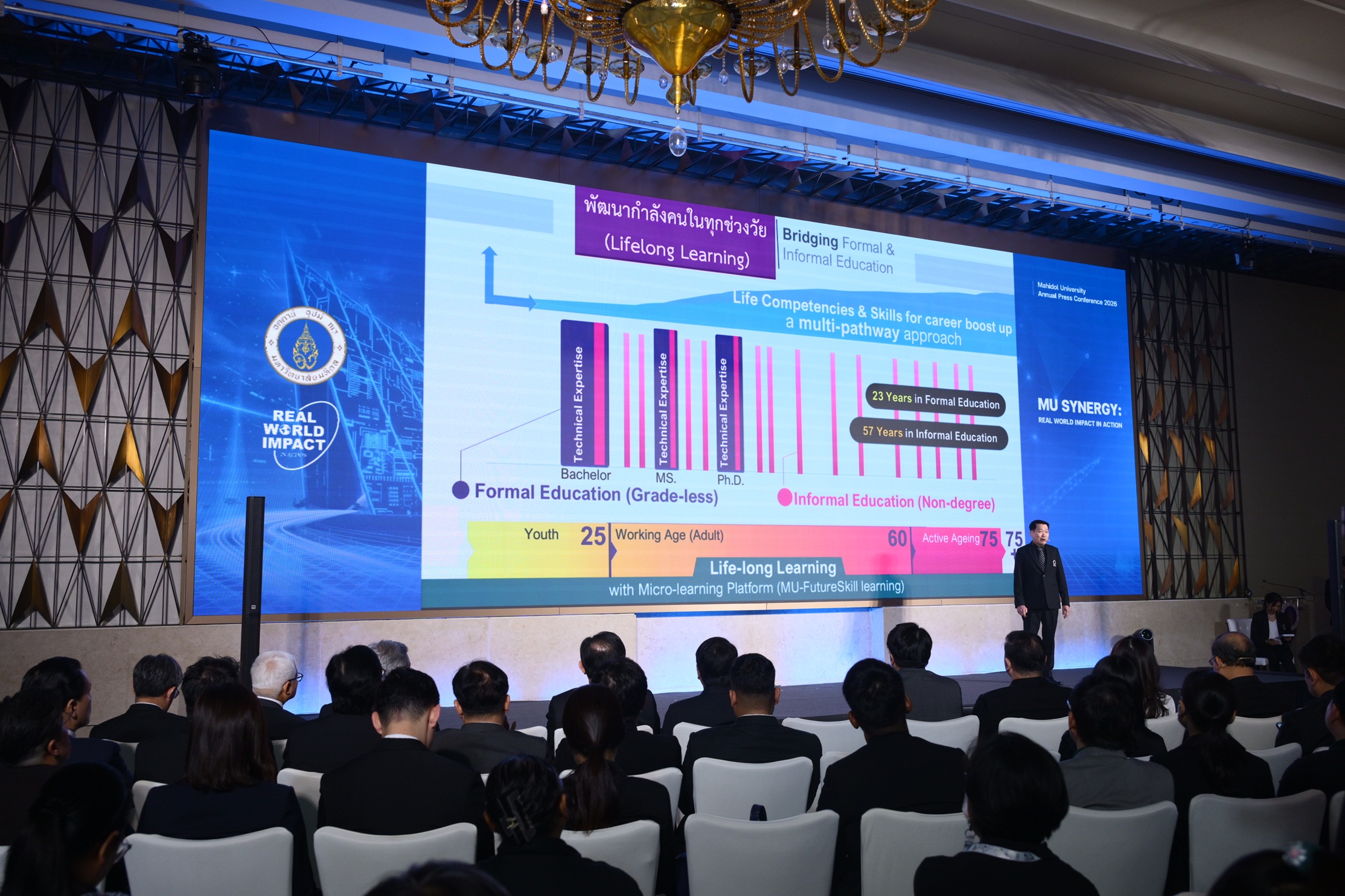 “การประกาศ MU SYNERGY: Real World Impact in Action ถือเป็นการยกระดับบทบาทของมหาวิทยาลัยมหิดลจากผู้ผลิตองค์ความรู้ สู่ผู้สร้างโครงสร้างพื้นฐานนวัตกรรมสังคมและเศรษฐกิจ ที่เชื่อมโยงมหาวิทยาลัย อุตสาหกรรม และเศรษฐกิจเข้าด้วยกันอย่างเป็นระบบ โดยมหาวิทยาลัยยังคงเดินหน้าตามยุทธศาสตร์ Real World Impact (ปี 2567-2571) โดยใช้ 3 กลไกหลัก ได้แก่ A1 – Synergistic and Collaborative Innovations (สานภารกิจวิจัย): มุ่งเน้นการบูรณาการงานวิจัยและนวัตกรรมร่วมกับภาคเอกชนและเครือข่ายระดับโลก เพื่อเปลี่ยนงานวิจัย “จากหิ้งสู่ห้าง” ให้เกิดมูลค่าทางเศรษฐกิจ A2 – Empowering Learners (เพิ่มอำนาจผู้เรียน): พัฒนาระบบการศึกษาแบบ Lifelong Learning และการเรียนรู้ผ่านการทำงานจริง (CWIE) เพื่อสร้างกำลังคนทักษะสูงที่พร้อมทำงานได้ทันที A3 – Amplifying Operations (ขยายผลสัมฤทธิ์): ยกระดับการดำเนินงานภายในให้มีประสิทธิภาพ คล่องตัว และยั่งยืน เพื่อสนับสนุนภารกิจของมหาวิทยาลัยในทุกมิติ ทั้งนี้เป้าหมายยุทธศาสตร์มุ่งเน้นที่การลงมือทำเพื่อสังคม สร้างความเปลี่ยนแปลงที่ยั่งยืน ขยายบทบาทจากสถาบันการศึกษาสู่ศูนย์กลางในการขับเคลื่อนสังคม สร้างผลกระทบที่จับต้องได้ร่วมขับเคลื่อนนโยบายสาธารณะ เพื่อยกระดับศักยภาพสู่การเป็นฟันเฟืองหลักในการขับเคลื่อนเศรษฐกิจ (Engine of Growth) ของประเทศ