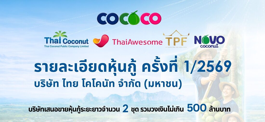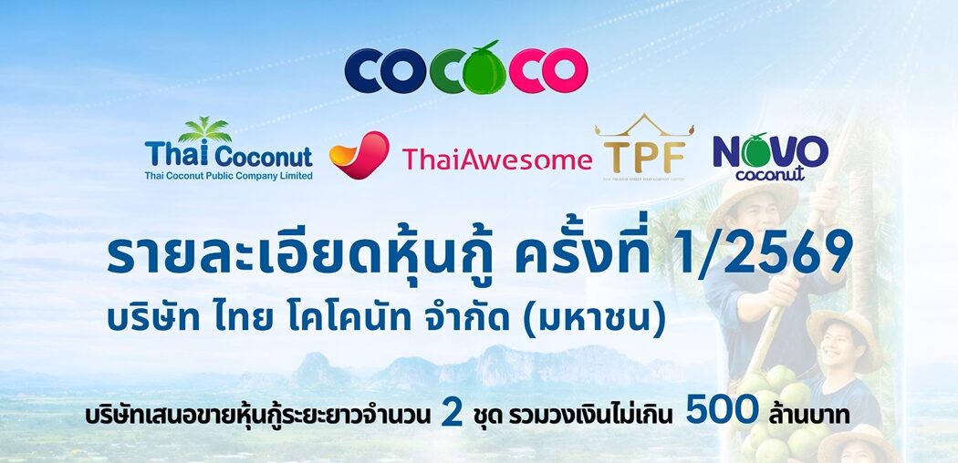 บริษัท ไทย โคโคนัท จำกัด (มหาชน) หรือ COCOCO ฮอตต่อเนื่อง! เดินหน้าเสนอขายหุ้นกู้ ดอกเบี้ย 4.85–5.05% อายุ 2–3 ปี เปิดจอง 27–29 เม.ย.นี้ หวังเสริมแกร่งการเงิน รองรับแผนขยายธุรกิจแบบจัดเต็ม งานนี้บอกเลยกระแสแรง นักลงทุนให้ความสนใจล้นหลาม จับตาใกล้ชิด เพราะยีลด์น่าสนใจ บวกกับพื้นฐานธุรกิจยังโตต่อเนื่อง โดยเฉพาะกลุ่มสินค้าเพื่อสุขภาพที่ยังคงเป็นเทรนด์มาแรงในตลาดโลก