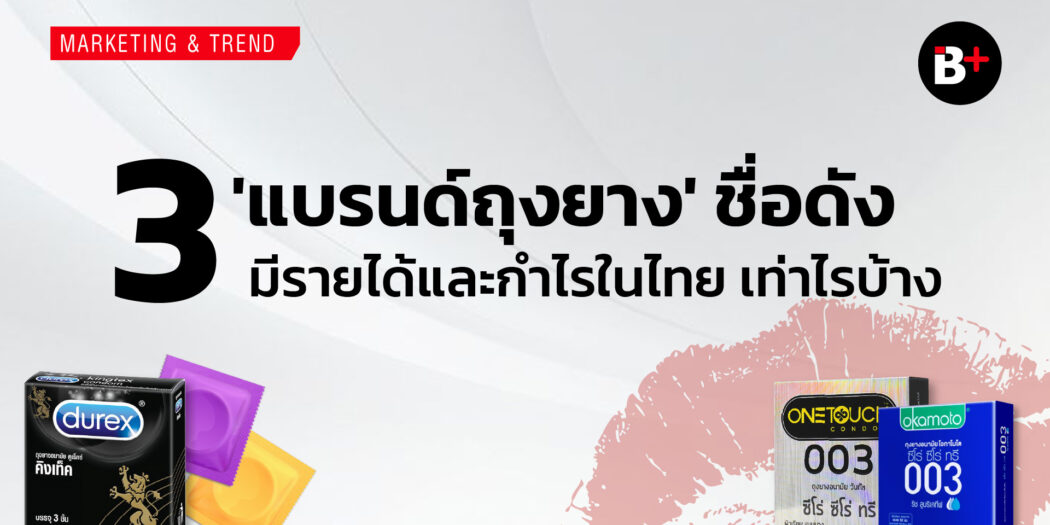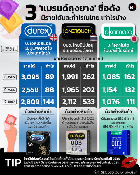 โดยผู้นำตลาดคือ Durex จากสหราชอาณาจักร ที่มีรายได้ปีล่าสุด 2,809 ล้านบาท และมีกำไร 144 ล้านบาท แบ่งเป็นการลดลงของรายได้เฉลี่ย 3.2% ต่อปี แต่กำไรเพิ่มขึ้นเฉลี่ย 17.4% ต่อปี ในช่วง 3 ปีที่ผ่านมา