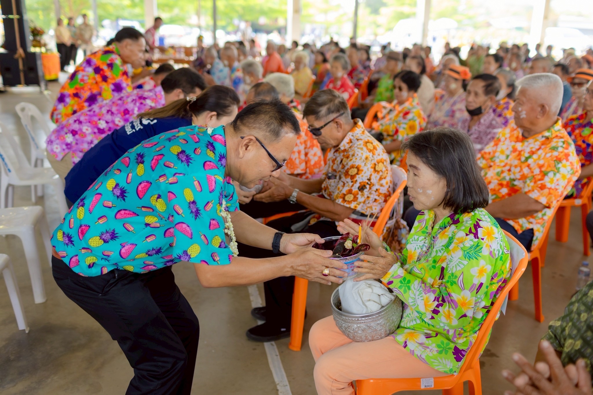นายกฤตยรัฐ ปารมี ผู้ช่วยเลขาธิการมูลนิธิเจริญโภคภัณฑ์พัฒนาชีวิตชนบท เปิดเผยว่า การจัดงานในครั้งนี้ มูลนิธิฯ มุ่งเน้นการมอบความสุขและเสริมสร้างคุณภาพชีวิตที่ดีแก่ผู้สูงอายุมากมาย ได้แก่ การตรวจสุขภาพเบื้องต้นแก่ผู้สูงอายุ โดยทีมนักบริบาลและหมอน้อยในพื้นที่ โดยไม่เสียค่าใช้จ่าย ภายใต้อีกหนึ่งโครงการของมูลนิธิฯ โครงการพัฒนาอาชีพด้านการบริบาล เพื่อช่วยให้ผู้สูงอายุได้ทราบถึงสภาวะสุขภาพของตนเอง และได้รับการแนะนำด้านสุขภาพที่ถูกต้อง มีการจัดเสวนา ในหัวข้อ “สุขใจวัยเก๋า ก้าวทันโลกยุกใหม่ 2025” ร่วมกับวิทยากรผู้ทรงคุณวุฒิ ได้แก่ คุณสุรเชษฐ์ พุ้ยน้อย นายอำเภอพาน รองศาสตราจารย์ ดร.รุ่งนภา เทพภาพ รองคณบดีฝ่ายวิชาการ วิทยาลัยสหวิทยาการ มหาวิทยาลัยธรรมศาสตร์ นายสมพงค์ ชําหา อดีตผู้อํานวยการโรงพยาบาลส่งเสริม สุขภาพตําบลหัวง้ม นายวินัย เครื่องไชย นายกองค์การบริหารส่วนตําบล หัวง้ม และ นายกฤตยรัฐ ปารมี ผู้ช่วยเลขาธิการมูลนิธิเจริญโภคภัณฑ์พัฒนาชีวิตชนบท และครูจิตอาสา พร้อมทั้ง ยังมีพิธีมอบเกียรติบัตรเชิดชูเกียรติผู้สูงอายุดีเด่น ประจําปี 2568 จํานวน 13 คน มีการแสดงรําวงประยุคของผู้สูงอายุ ต.หัวง้ม และสืบสานประเพณีสงกรานต์ ขนบธรรมเนียมและประเพณี โดยจัดพิธีสรงน้ำพระและรดน้ำดําหัวผู้สูงอายุ