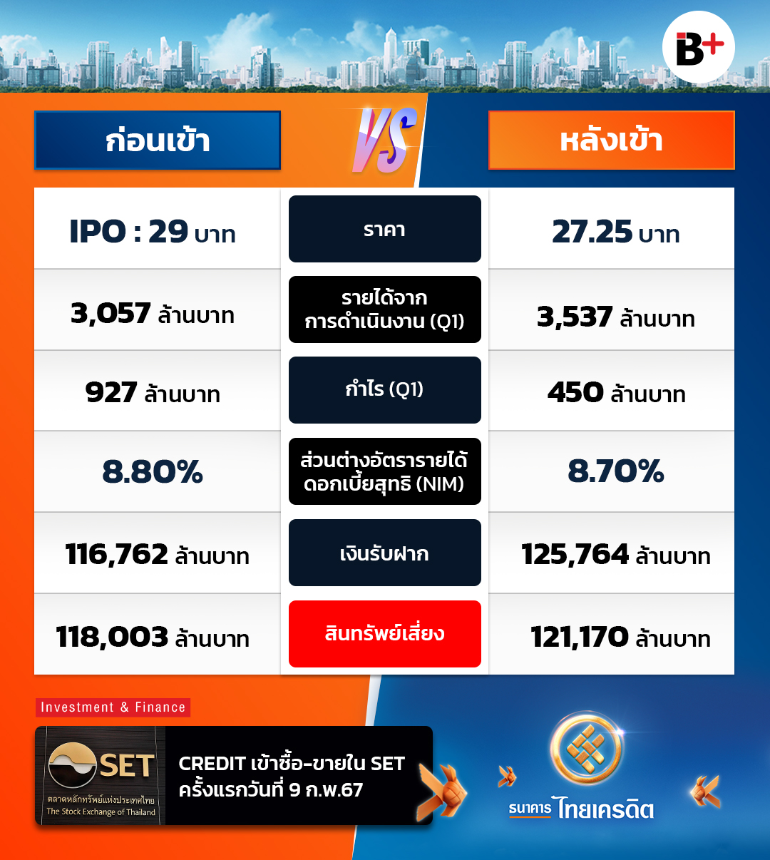 ธนาคารไทยเครดิต จำกัด (มหาชน) หรือ CREDIT ประกาศงบไตรมาส 1/2567 ออกมามีกำไรสุทธิ 449.58 ล้านบาท ลดลงจากช่วงเดียวกันเมื่อปีก่อนค่อนข้างมาก โดยสาเหตุจะเกิดจากอะไร? และมีอะไรเปลี่ยนแปลงไปบ้างหลังจากเข้าตลาดหุ้นไปเมื่อช่วงต้นเดือน ก.พ.2567 ทาง ‘Business+’ ได้ทำการสำรวจตัวเลขทางการเงินที่สำคัญๆ เอาไว้ดังนี้