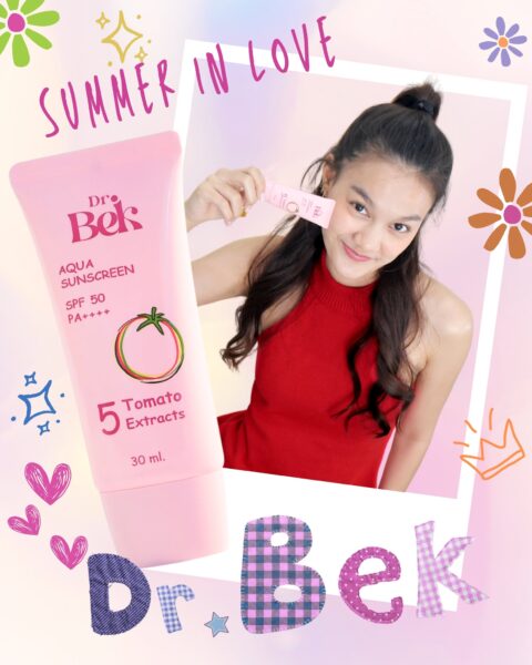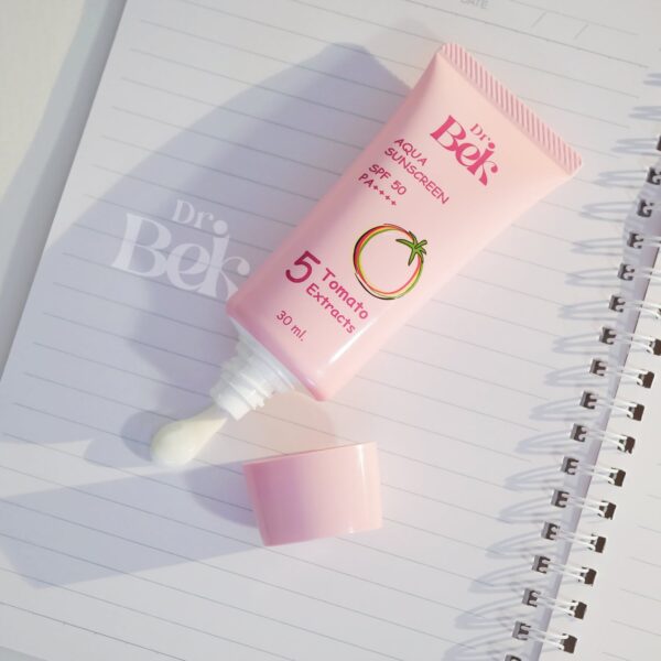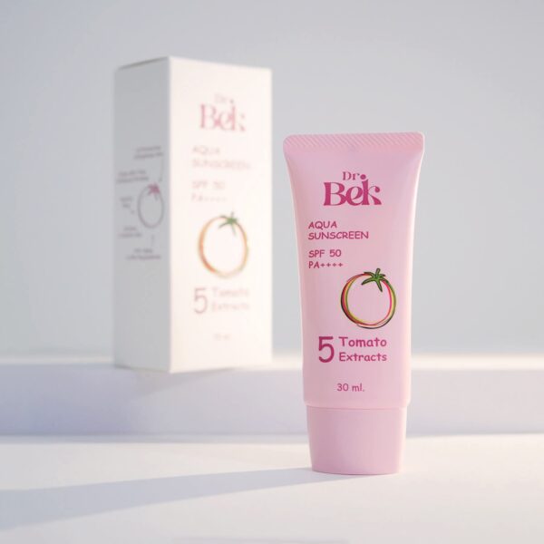 ขั้นตอนสุดท้าย ปกป้องผิวหน้าด้วย Dr.Bek Aqua Sunscreen SPF50 PA++++ (ด๊อกเตอร์ เบค อควา ซันสกรีน เอสพีเอฟ 50 พีเอ ++++) กันแดดสูตรน้ำ เนื้อบางเบา เกลี่ยง่าย อ่อนโยนต่อผิว ไม่ก่อให้เกิดการอุดตัน พร้อมบำรุงผิวด้วยสารสกัดจากมะเขือเทศ 5 สี ช่วยปกป้องผิวจากรังสี UVA และ UVB ทำให้ผิวดูสว่างกระจ่างใสขึ้นอีก 1 ระดับ สามารถทาทับเมคอัพได้ ไม่เป็นคราบ จำหน่าย ขนาด 30 ml ราคาหลอดละ 390 บาท