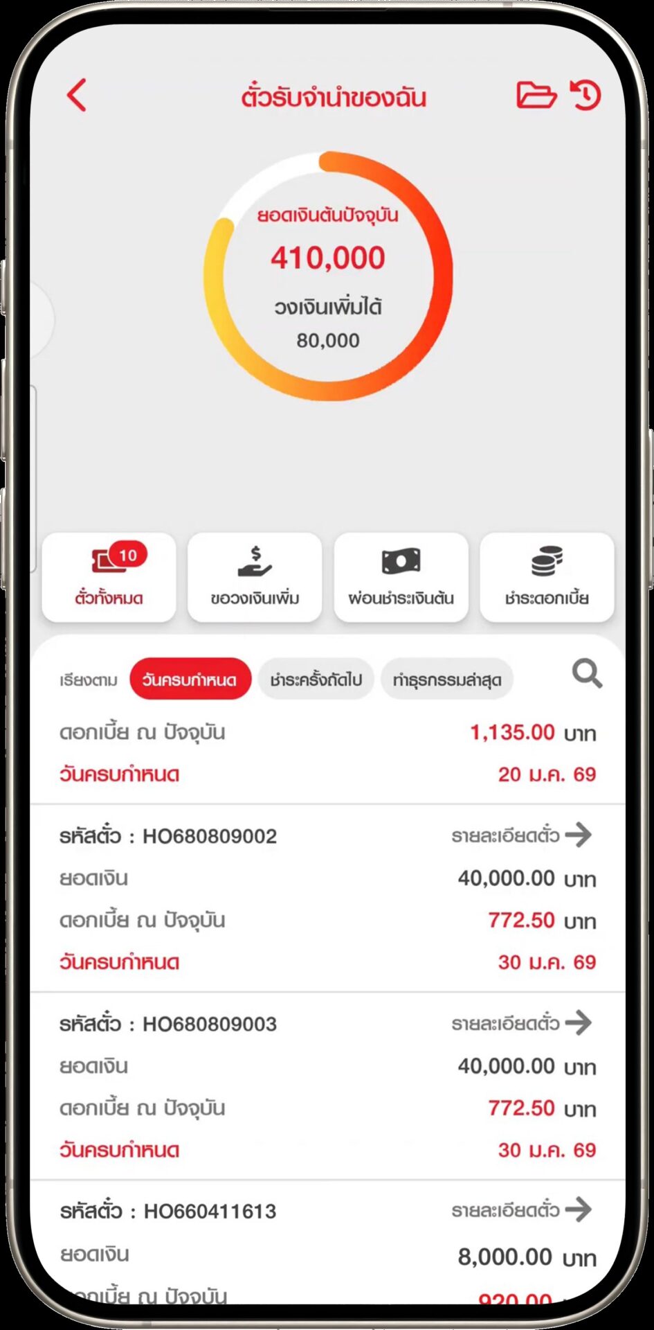 - ตรวจสอบสถานะตั๋วจำนำ / ประวัติการชำระ– ดูข้อมูลแบบเรียลไทม์จากระบบกลาง