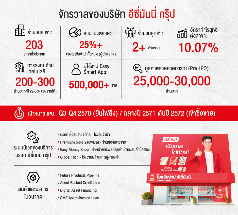 ที่สำคัญ การมีสถานะเป็นบริษัทจดทะเบียนยังช่วยดึงดูดบุคลากรคุณภาพ ทั้งในระดับบริหารและระดับปฏิบัติการให้เข้ามาร่วมสร้างองค์กรในระยะยาว ซึ่งสอดคล้องกับวิสัยทัศน์การเติบโตแบบ Quality Growth ของ Easy Money ที่ให้ความสำคัญกับระบบ คน และมาตรฐาน มากกว่าการขยายตัวอย่างรวดเร็วเพียงเชิงปริมาณ โดยบริษัทคาดว่าจะเริ่มเห็นความชัดเจนของการเตรียมตัวภายในระยะเวลา 3 ปี และมีโอกาสเข้าจดทะเบียนได้ราวปี 2571–2572
