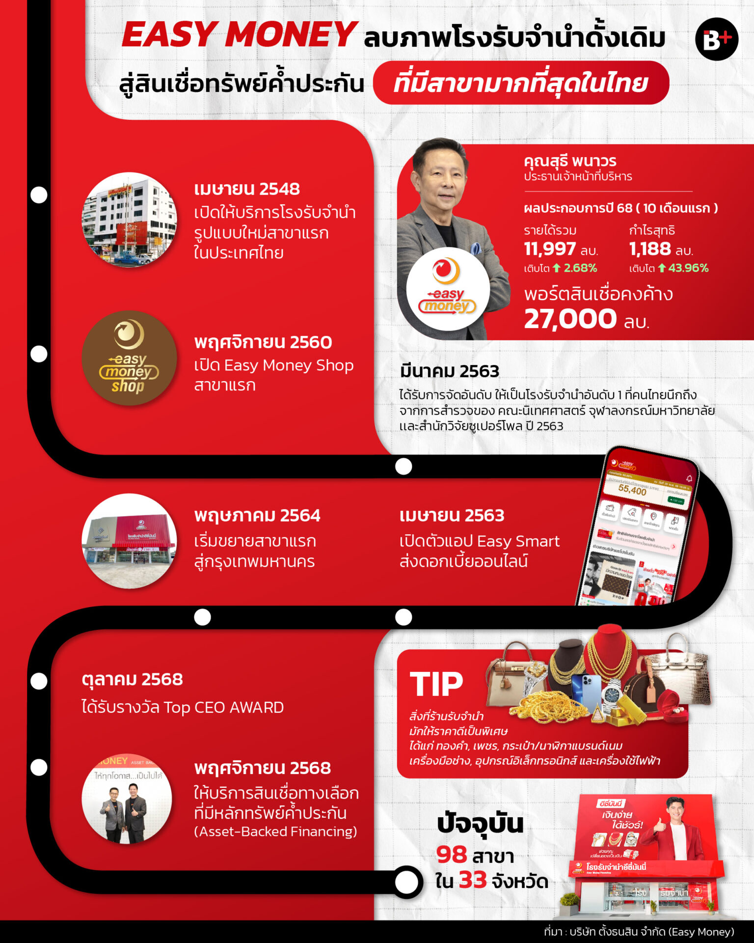 ซึ่งโมเดล Asset-Backed Financing ของ Easy Money Group จึงไม่ใช่แค่การปฏิรูปโรงรับจำนำในเชิงธุรกิจ หากแต่เป็นการขยายขอบเขตของระบบการเงินไทยให้ครอบคลุมผู้คนได้มากขึ้น เปิดพื้นที่ให้คนที่มีทรัพย์แต่ขาดสภาพคล่องสามารถยืนอยู่ในระบบอย่างมีศักดิ์ศรี และบริหารเงินของตนเองได้อย่างชาญฉลาด