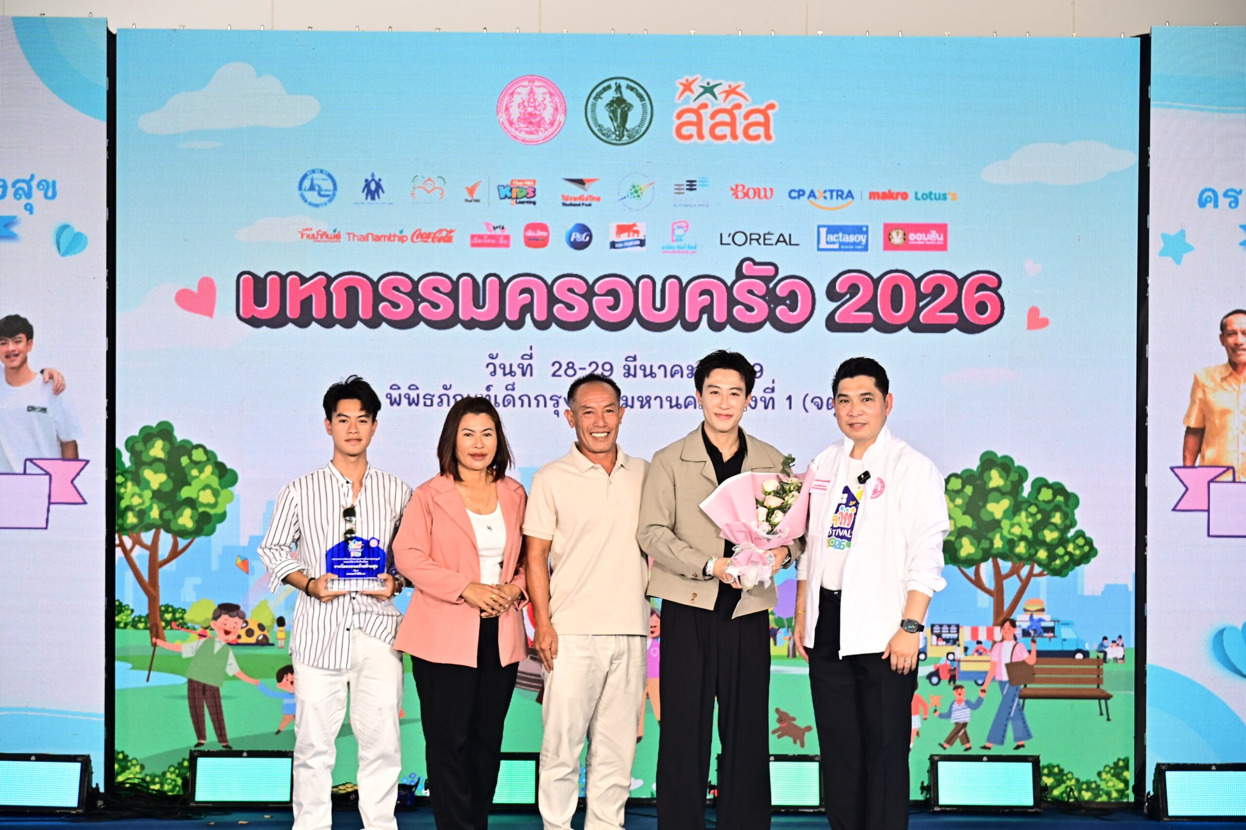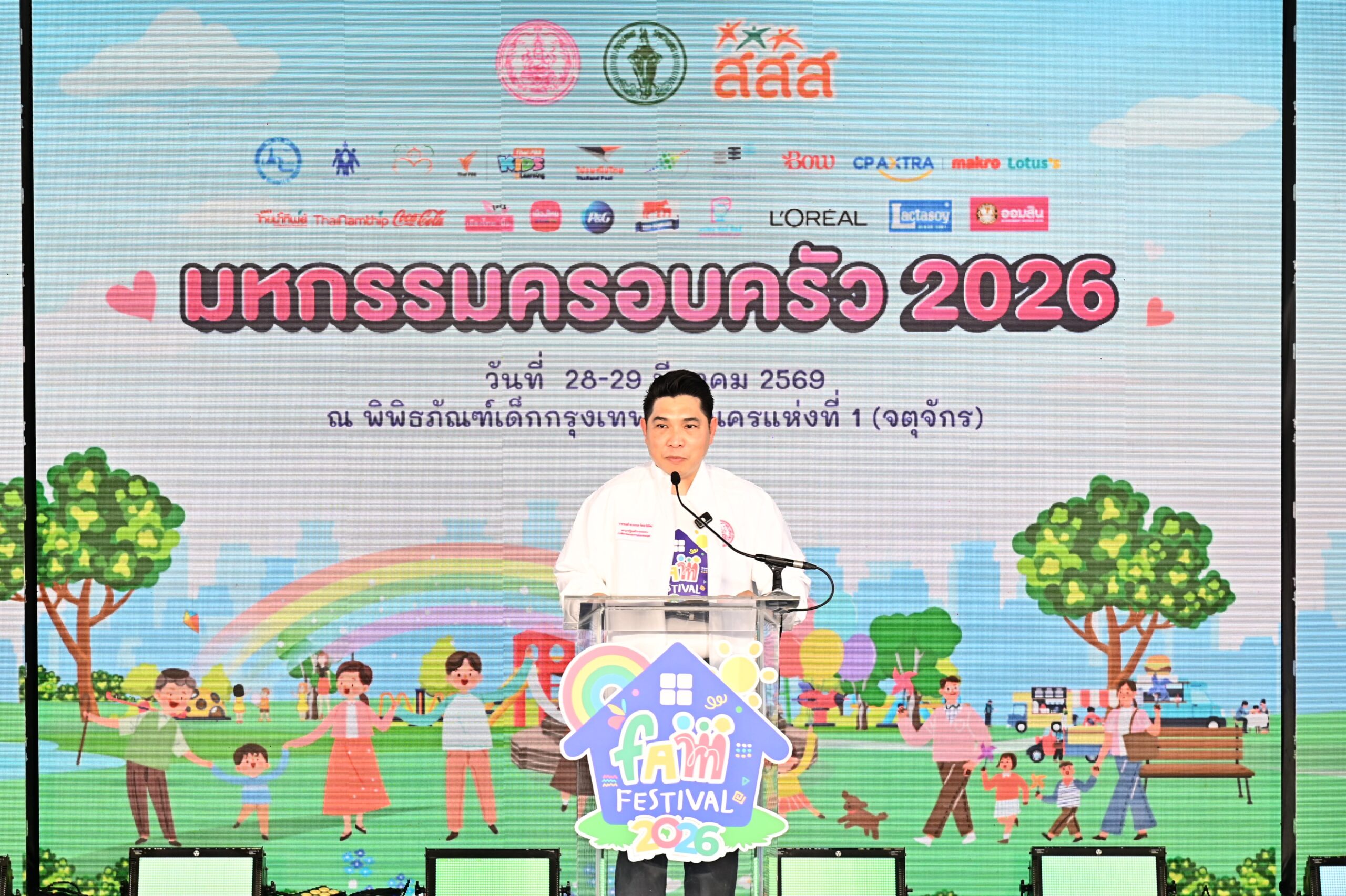 วันที่ 28 มีนาคม 2569 เวลา 13.00 น. นายกองตรี ดร.ธนกฤต จิตรอารีย์รัตน์ เลขานุการรัฐมนตรีว่าการกระทรวงการพัฒนาสังคมและความมั่นคงของมนุษย์ เป็นประธานในพิธีเปิดงาน “มหกรรมครอบครัว (FAM FESTIVAL 2026)” ภายใต้แนวคิด “COSMIC FAMILY – Always Together : ใกล้ใจ ไม่ไกลกัน” เพื่อเปิดพื้นที่ให้เด็กและครอบครัวได้ใช้เวลาร่วมกันอย่างสร้างสรรค์ พร้อมมอบรางวัล “ครอบครัวสร้างสุข” โดยมี นางจตุพร โรจนพานิช อธิบดีกรมกิจการสตรีและสถาบันครอบครัว พร้อมด้วย นายศานนท์ หวังสร้างบุญ รองผู้ว่าราชการกรุงเทพมหานคร นางภรณี ภู่ประเสริฐ ผู้ช่วยผู้จัดการกองทุนสนับสนุนการสร้างเสริมสุขภาพ และรักษาการผู้อำนวยการสำนักสนับสนุนสุขภาวะเด็ก เยาวชน และครอบครัว (สสส.) และผู้แทนหน่วยงานที่เกี่ยวข้อง เข้าร่วมงาน ณ พิพิธภัณฑ์เด็กกรุงเทพมหานครแห่งที่ 1 (จตุจักร) กรุงเทพฯ