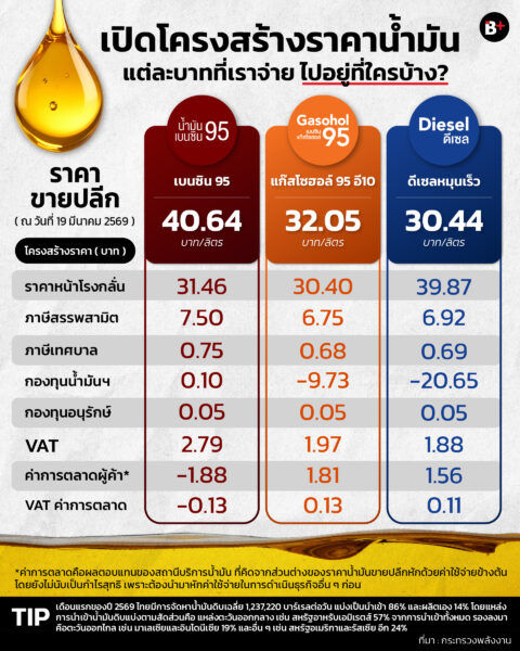 ที่เป็นแบบนี้ก็อาจจะเพราะว่า ไทยมีกองทุนน้ำมันเชื้อเพลิง ที่คอยรักษาเสถียรภาพของราคาน้ำมันในประเทศไว้อยู่ จึงมาถึงคำถามที่ว่าแล้วเวลาเราเข้าปั๊มเติมน้ำมัน แต่ละบาทที่เราจ่ายไปจะไปอยู่ที่ไหนบ้าง