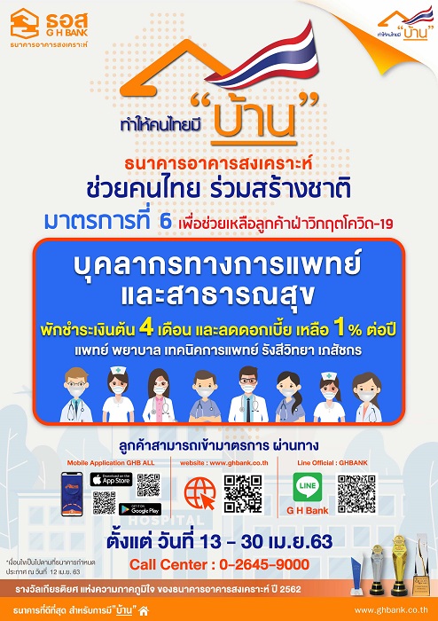 ธนาคารอาคารสงเคราะห์ ประกาศยกระดับความช่วยเหลือเพิ่มเติมให้แก่ลูกค้าของธนาคารที่ได้รับผลกระทบจาก Covid-19 ในมาตรการที่ 5 โดยหลังจากพักชำระเงินต้นและดอกเบี้ยเป็นระยะเวลา 4 เดือนแล้ว ธนาคารจะยกดอกเบี้ยที่พักชำระไว้ทั้ง 4 เดือนให้กับลูกค้า เมื่อสิ้นสุดระยะเวลากู้ตามสัญญา สำหรับลูกค้าทุกวัตถุประสงค์การกู้ที่มีวงเงินกู้ทุกบัญชีรวมกันไม่เกิน 3 ล้านบาท และมีรายได้ต่อเดือนไม่เกิน 35,000 บาท ครอบคลุมลูกค้า 1.1 ล้านบัญชี ทั้งสถานะบัญชีตามปกติ และสถานะบัญชีดอกเบี้ยผิดนัดหรือสถานะกฎหมาย และเตรียมกรอบวงเงิน 10,000 ล้านบาท จีดทำมาตรการที่ 6 พักชำระเงินต้นระยะเวลา 4 เดือน พร้อมลดดอกเบี้ยเหลือ 1.00% ต่อปี สำหรับ ‘บุคลากรทางการแพทย์และสาธารณสุข’ แจ้งความประสงค์เข้ามาตรการผ่าน Mobile Application : GHB ALL ตั้งแต่วันที่ 13 – 30 เมษายน 2563