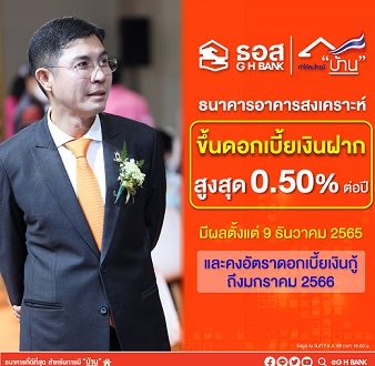 ธนาคารอาคารสงเคราะห์ ประกาศปรับขึ้นอัตราดอกเบี้ยเงินฝากประจำ และใบรับเงินฝากประจำ ประเภท 2 ปี 3 ปี และ 5 ปี 0.10 – 0.50% ต่อปี เพื่อให้สอดคล้องกับการปรับขึ้นอัตราดอกเบี้ยนโยบายของคณะกรรมการนโยบายการเงิน(กนง.) และสนับสนุนการออมของประชาชนให้ได้รับผลตอบแทนเพิ่มขึ้น โดยมีผลตั้งแต่วันศุกร์ที่ 9 ธันวาคม 2565 พร้อมคงอัตราดอกเบี้ยเงินกู้ไว้ในระดับเดิมอย่างน้อยถึงช่วงสิ้นเดือนมกราคม 2566
