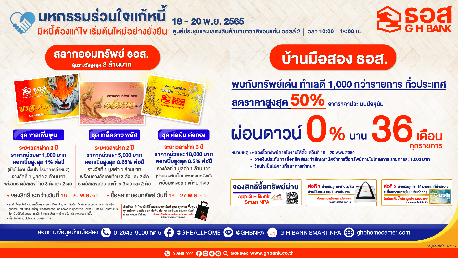ทั้งนี้ ผู้ที่สนใจสามารถลงทะเบียนเข้าร่วมงานมหกรรมผ่านระบบของธนาคารแห่งประเทศไทยได้ที่ https://ln15.gsb.or.th/WEB-DEBT/ สอบถามรายละเอียดเพิ่มเติมได้ที่ ธอส.ทุกสาขาทั่วประเทศ G H Bank Call Center โทร 0-2645-9000 หรือ Facebook Fanpage ธนาคารอาคารสงเคราะห์ และติดตามข่าวสารของธนาคารได้ที่ Mobile Application : GHB ALL , Mobile Application : GHB ALL GEN และ www.ghbank.co.th