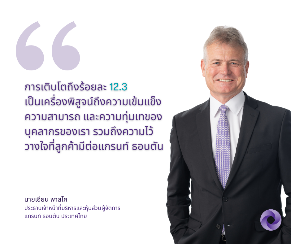 แกรนท์ ธอนตัน ประเทศไทยสร้างผลงานเติบโตอย่างโดดเด่นถึง 12.3% ในปีที่ผ่านมา สอดคล้องกับอัตราการเติบโตเฉลี่ยของภูมิภาคเอเชียแปซิฟิกที่ 11.2% ความสำเร็จนี้ตอกย้ำบทบาทของบริษัทในฐานะหนึ่งในผู้มีส่วนสำคัญต่อความสำเร็จของเครือข่ายในภูมิภาค โดยผสานมาตรฐานระดับโลกเข้ากับความเชี่ยวชาญในตลาดท้องถิ่น เพื่อช่วยธุรกิจรับมือความซับซ้อนและคว้าโอกาสใหม่ ๆความสำเร็จนี้สะท้อนถึงการมุ่งเน้นด้านธรรมาภิบาลที่แข็งแกร่งและการให้บริการที่มีคุณภาพสูงอย่างต่อเนื่อง ขณะเดียวกันเครือข่ายแกรนท์ ธอนตันทั่วโลกทำสถิติรายได้สูงสุดที่ 8.5 พันล้านดอลลาร์สหรัฐ เติบโต 6.1% (ตามอัตราแลกเปลี่ยนคงที่) พร้อมทีมงานกว่า 80,000 คน เพิ่มขึ้น 5.3% จากปีก่อน